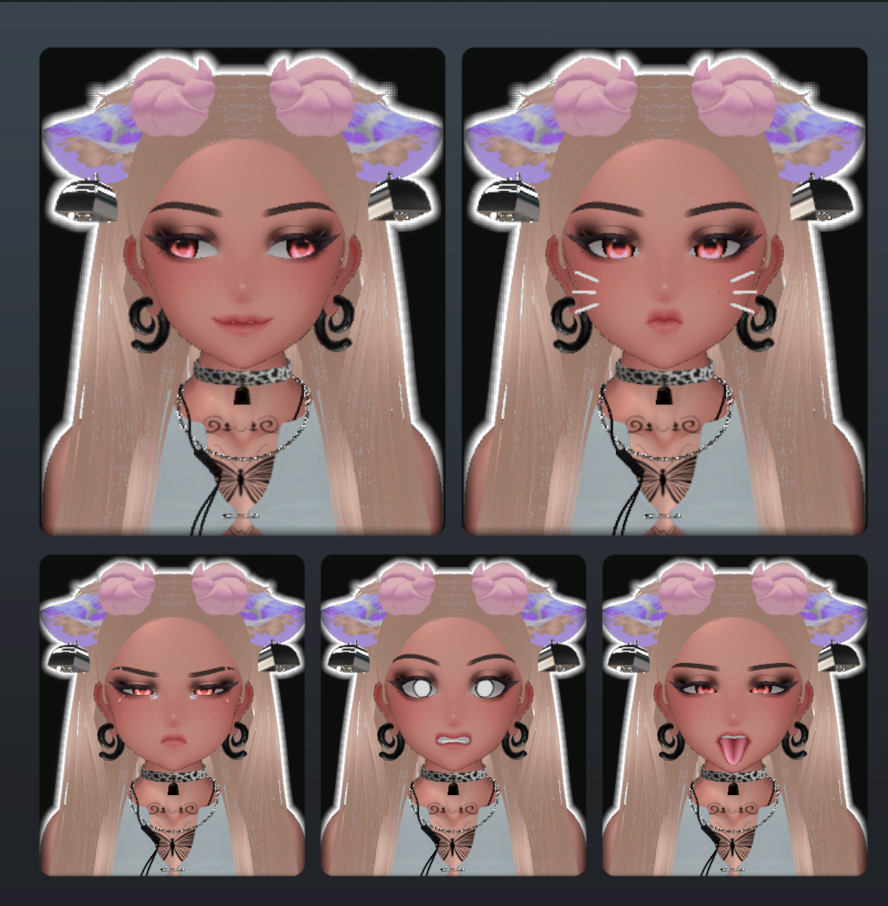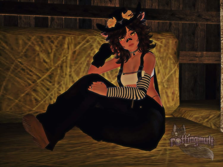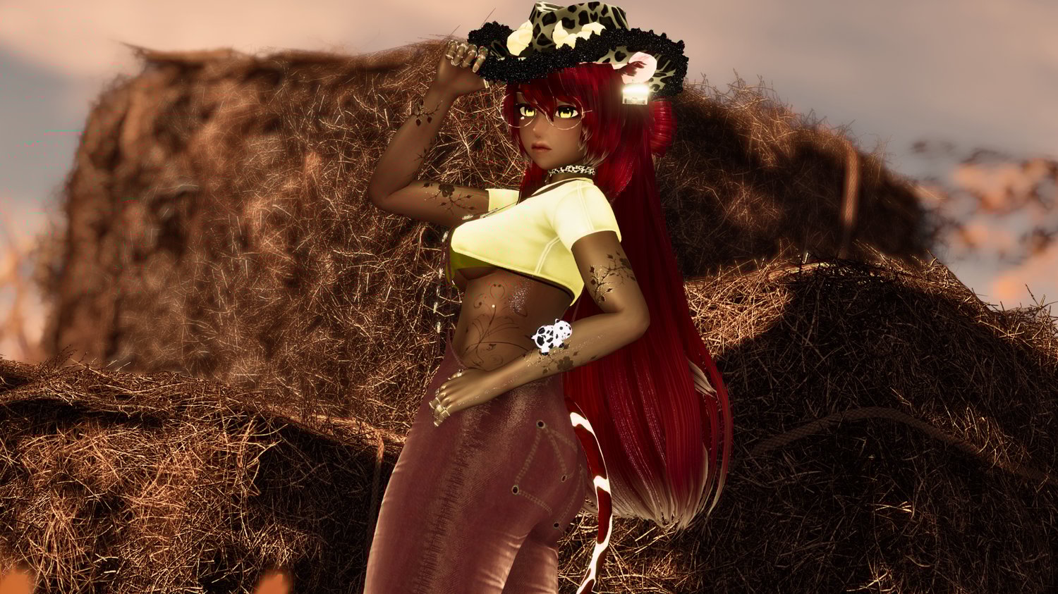Body I Head I Bra n undies/ Choker I Crop Top/Overalls I Tank Top/Shorts/Boots/Cowboy Hat/Jorts/Short Fluffy Hair I Tshirt/Arm Warmers/ Earphones I Undies/Jeans/Hairs/Cow Ears n Horns/ Fluffy Hat/Trucker Hat/ Hairs/ I Romper I High Tops I Sandals I Boots I Bandaids/Metal Hearts I Glasses/Sunflower I Gauges I Necklace I Belly Piercing I Harness I Fishnet I Cow Tail I Rings I Mini Cow/ Plushie I Follower I Tattoo I Lighting I Limb Scaling I Fake Index