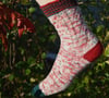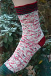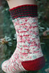 These socks are inspired by that fun holiday confection. The sock is worked toe-up with contrast toe, heels, and cuff. The leg is worked in a wide faux cable worked only with increases and decreases. No cable needle required. You are sure to love this relaxing holiday knit.