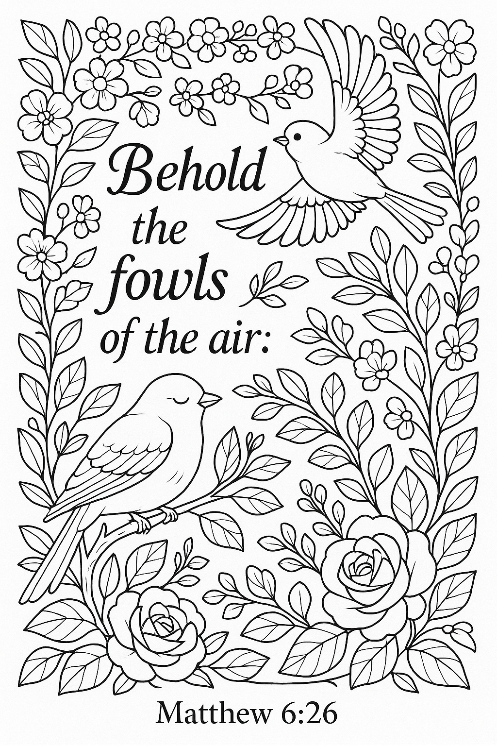 ๐๏ธ๐ธ Behold the Fowls โ Matthew 6:26 Bird & Floral Coloring Page