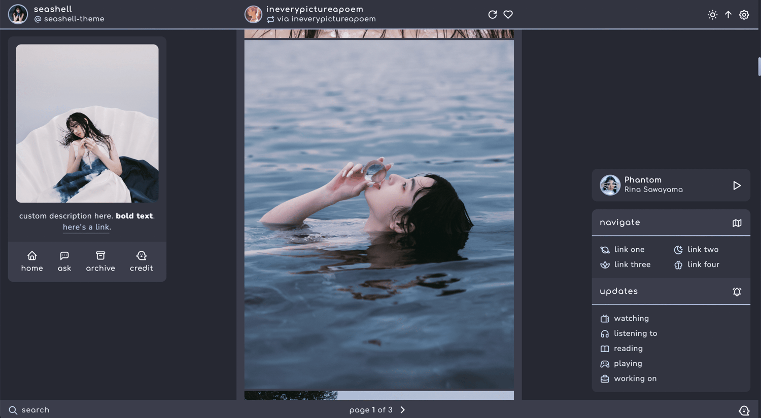 - optional: music player, extra links, updates, sticky bottom post info, tags on click, glow effect