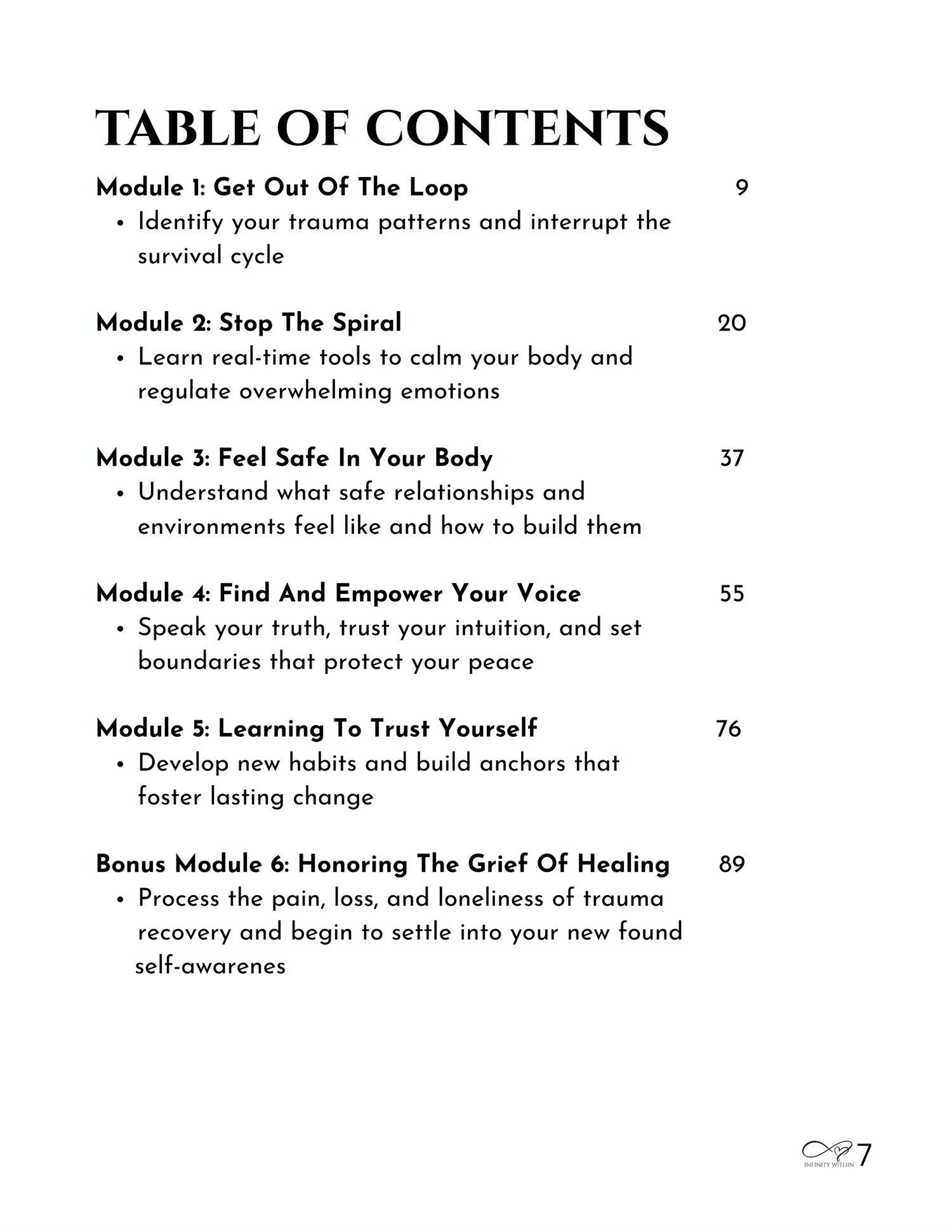 Five Core Modules + One Bonus Module to help you regulate your nervous system, build boundaries, and reconnect with your body.