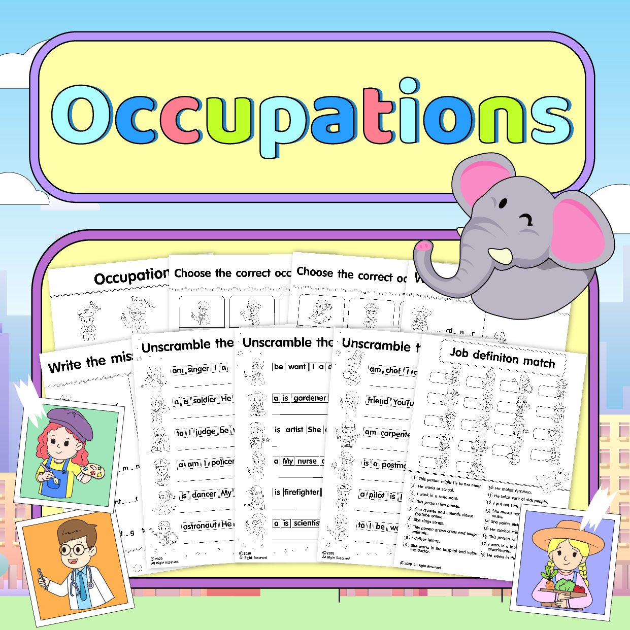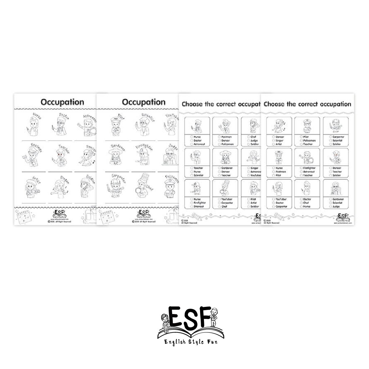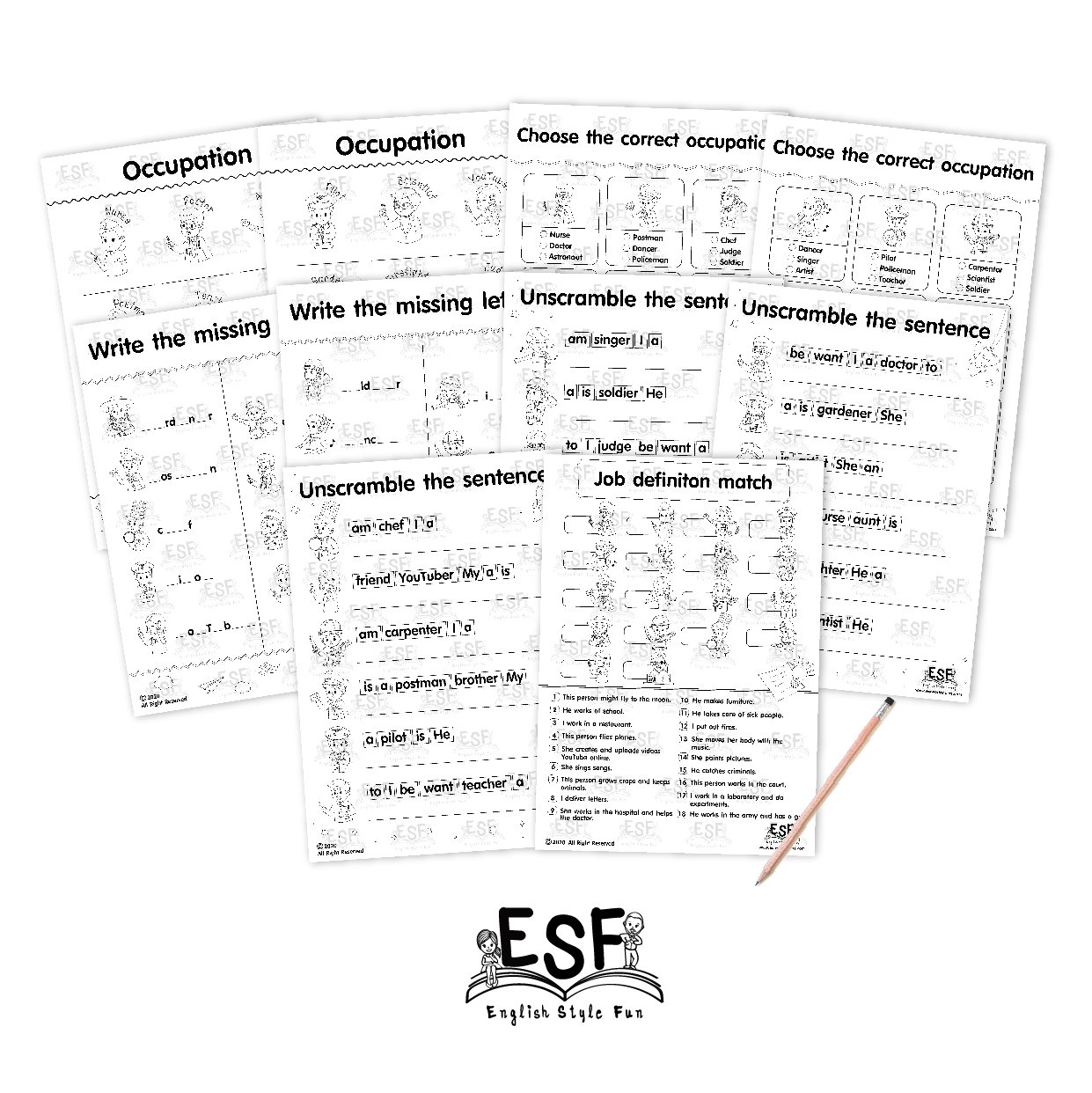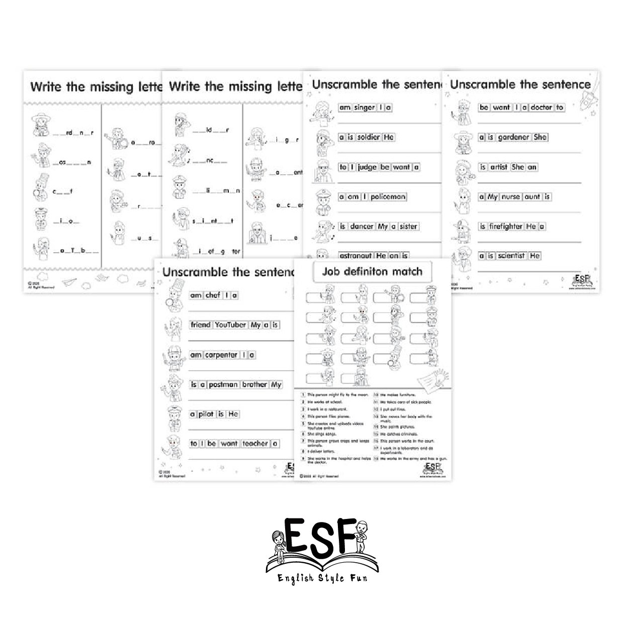 In this set of worksheets the student will learn the basic terms for jobs such as: nurse, doctor astronaut, postman, teacher, dancer, artist. singer, soldier, pilot, scientist, youtuber, gardener, firefighter, judge, carpenter, chef, and policeman. They will learn through writing, matching, unscrambling, choosing, fill in the blank, and searching. I tried to make the worksheets look fun to keep them focused and not bored at the same time.