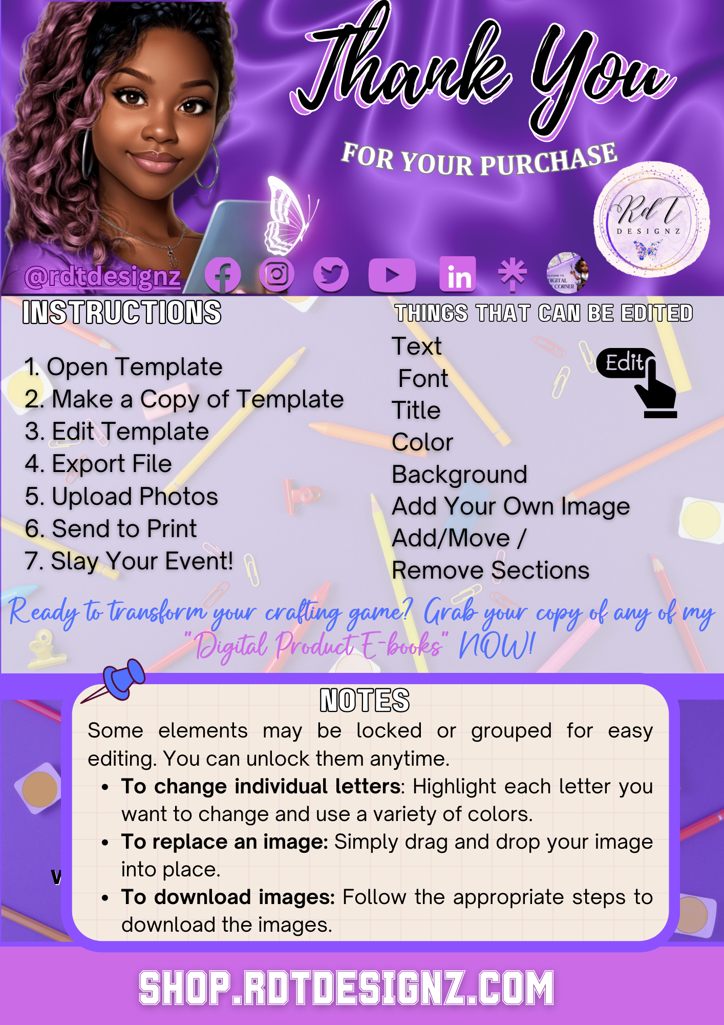 This is a DIGITAL ITEM ACCESSED THROUGH A DIGITAL DOWNLOAD. NO PHYSICAL ITEM WILL BE SENT OR MAILED TO YOU. You will receive a PDF with a link to an editable Canva Template. A Canva Pro account may be required for printing. You can use these digital files for personal and commercial purposes on physical items. Â