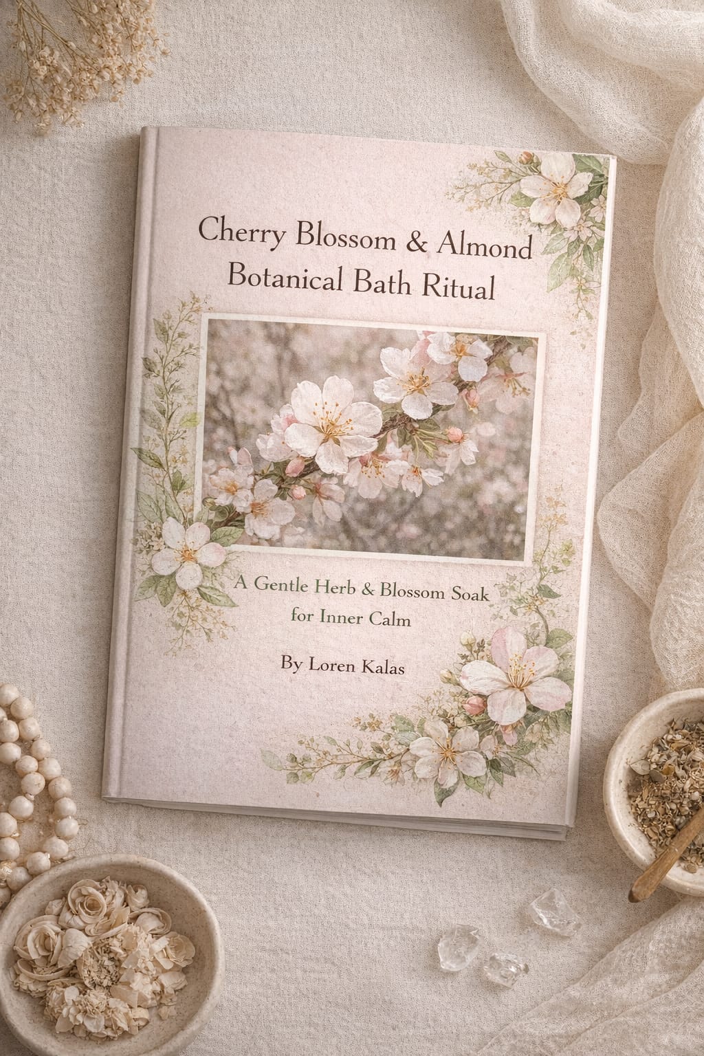 This elegant booklet presents a gentle floral bath ritual built around cherry blossom, peach leaf, almond, and calming herbs, thoughtfully arranged within a soft botanical design.