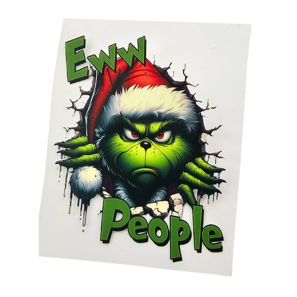 If people-ing isnβt on your holiday to-do list, this oneβs for you! The Grinch Eww People Decal is perfect for adding a little sarcasm and seasonal shade to your favorite items. Whether you're wrapping a 16 oz Libbey glass, tumbler, coffee mug, or decorating a journal or book cover, this UV DTF transfer keeps it realβand festive.