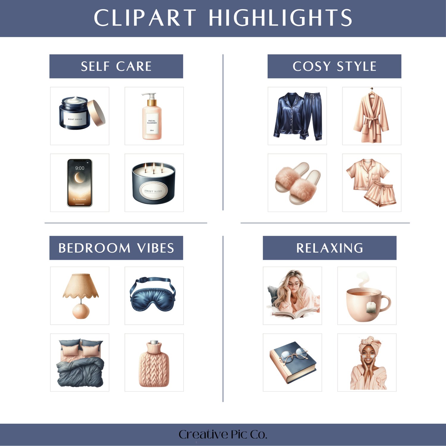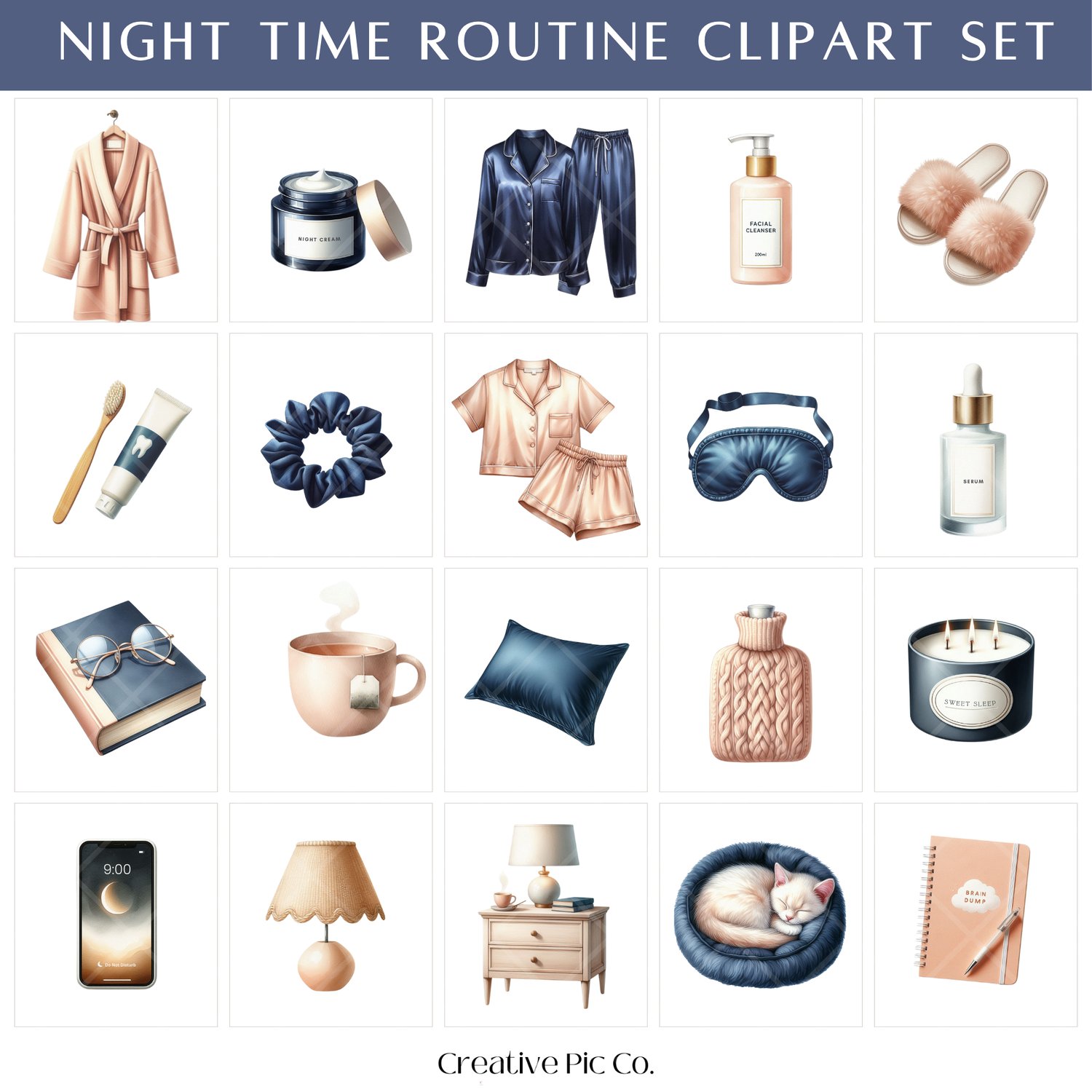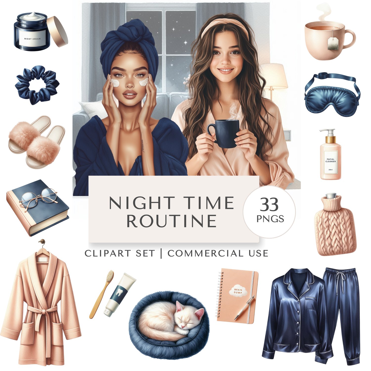 Unwind and get cosy with this Night Time Routine Clipart Collection. Featuring 33 high-resolution PNG illustrations, this set includes everything from satin pyjamas, robes, candles, and tea mugs to scrunchies, lamps, beds, and evening skincare essentials. Designed in a soft watercolour style, it’s perfect for creating calming planner spreads, wellness journals, sleep hygiene, cosy lifestyle branding, and social media graphics with a soothing nighttime aesthetic.