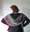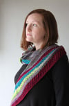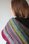 The original sample is knit in hand-dyed & hand-spun yarn. The contrast colours have been selected to complement speckles & splashes of contrasting colour in the hand-dyed Merino Fibre from Hedgehog Fibres,used for the main colour yarn. The shawl could also be knit in one single colour, or a combination of handspun and/or commercial yarns, even using stash leftovers for the contrast sections.