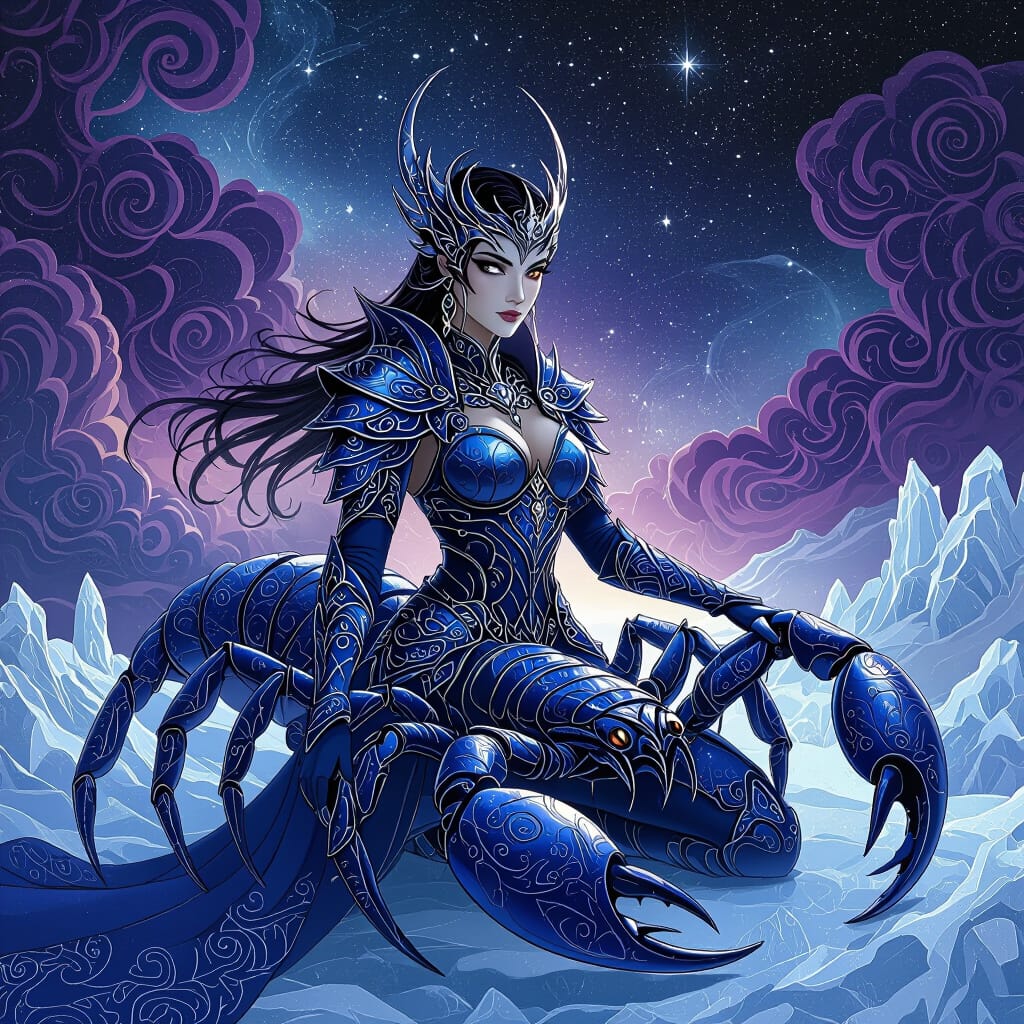 Description: A formidable queen in intricate blue armor and a crescent-moon crown sits regally upon a giant scorpion, which is woven into the design of her flowing gown. Surrounded by an otherworldly landscape of ice and jagged peaks, she is a vision of power under a swirling, starlit sky. This magnificent piece is perfect for collectors who are drawn to fantasy, mythology, and the majestic spirit of the cosmos.