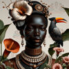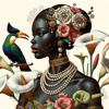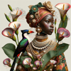 3D renderings that capture the elegance of black women and the South African bird, Knysna Turaco surrounded by African calla lilies that combine the aesthetics of Japanese art with African art. They are surrounded by African calla lilies and adorned with sophisticated pearls and vintage brooches.