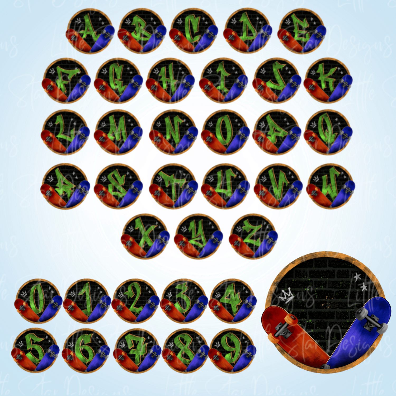 This is a high-quality hand drawn (300dpi PNG) clipart set digital download of my original artwork, titled “Skateboard Alpha & Numbers”, designed for sublimation and print.
