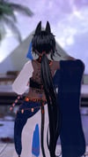 Hair, collar, top, jackal ears, tail, jewelry, mask, panties, pants, shawl, shoes, sleeve, veil, staff, whip, female private parts, Anubis statue, pillows and all the textures to it are made from scratch by me in Blender and Substance Painter.