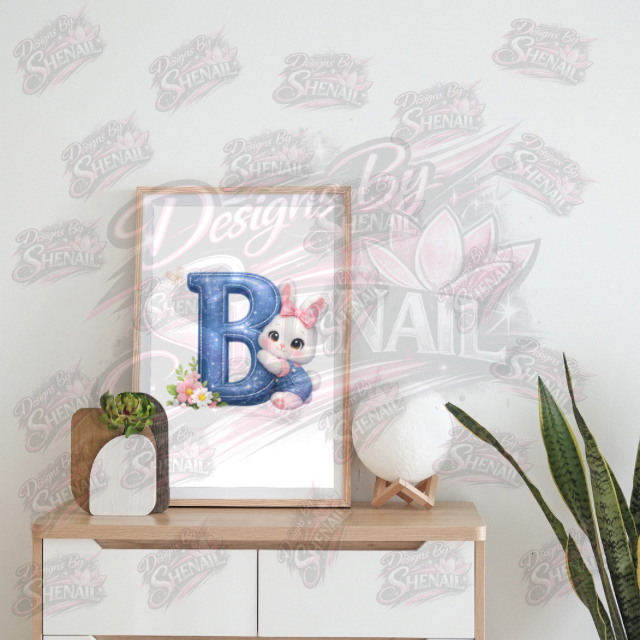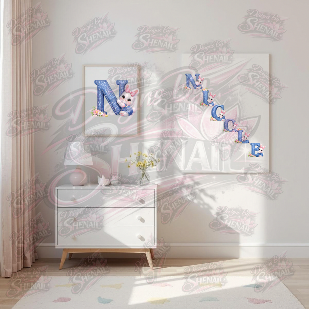 Each letter is styled with a glittery denim look and a cute bunny companion, giving your projects a whimsical storybook feel. The soft flowers, butterflies, and Easter eggs add an extra touch of springtime magic.