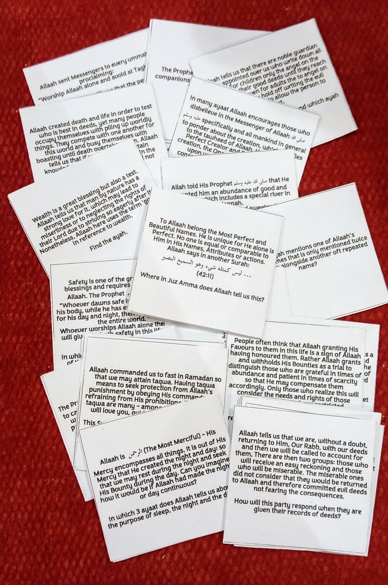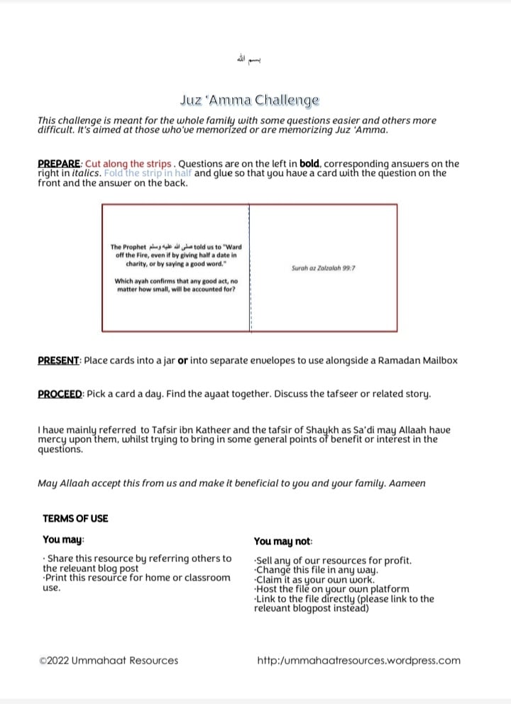 A no frills family challenge on Juz 'Amma. Pick a card a day. Find the ayaat together. Discuss the tafseer or related story.