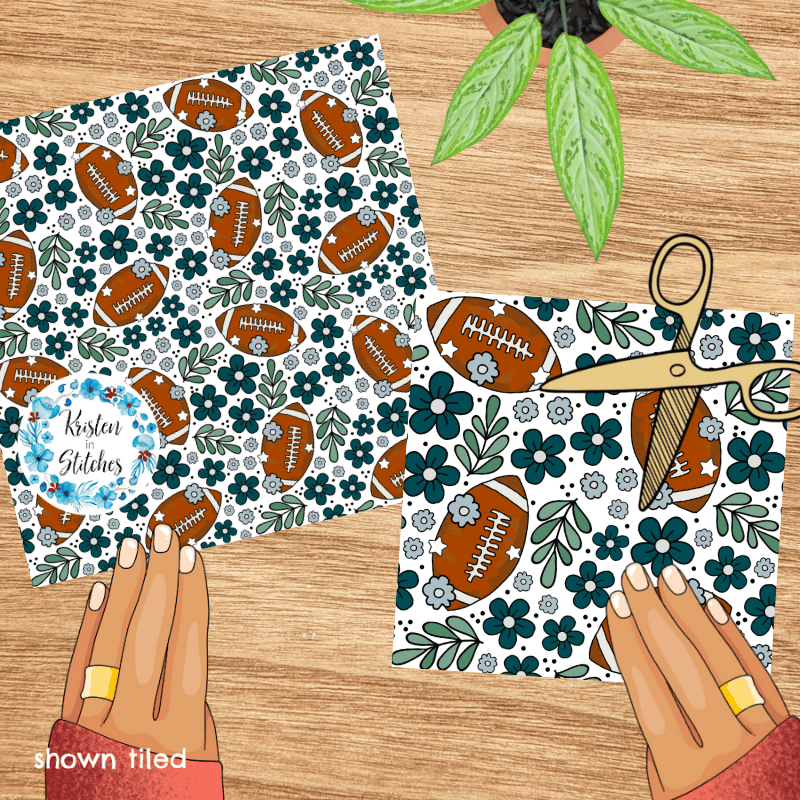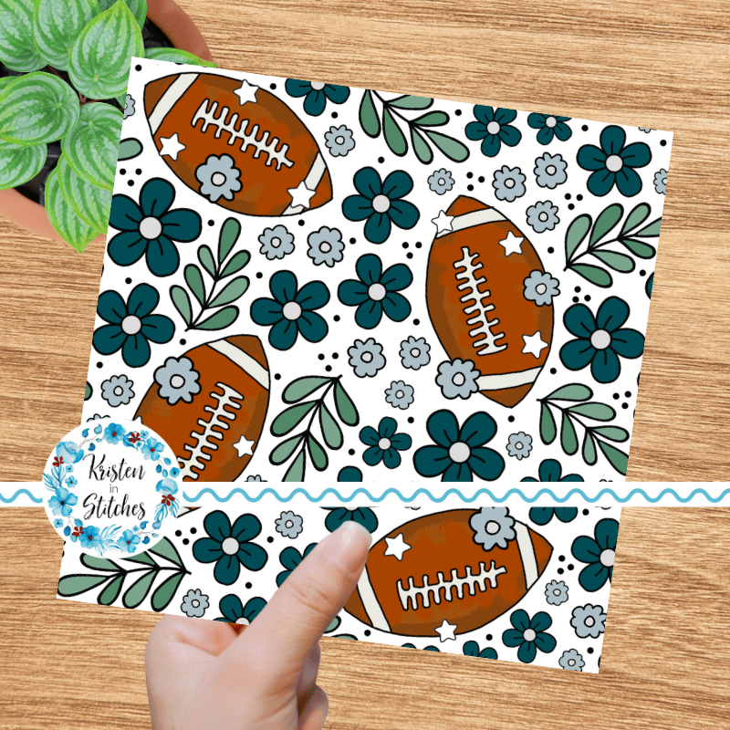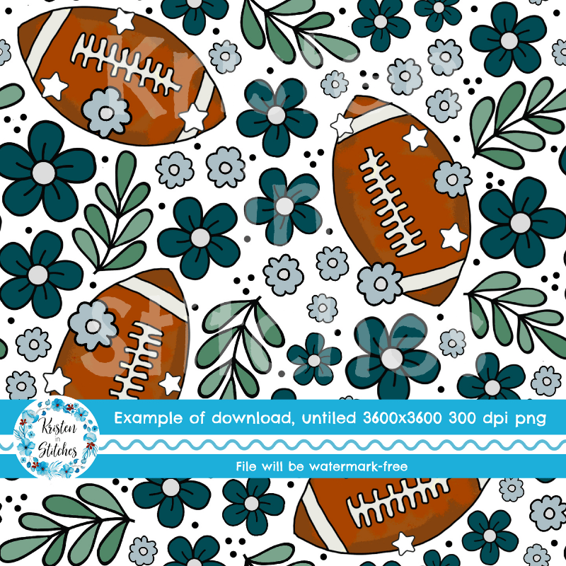 Footballs and flowers with Philadelphia Eagles colors Midnight green, silver grey and white.
