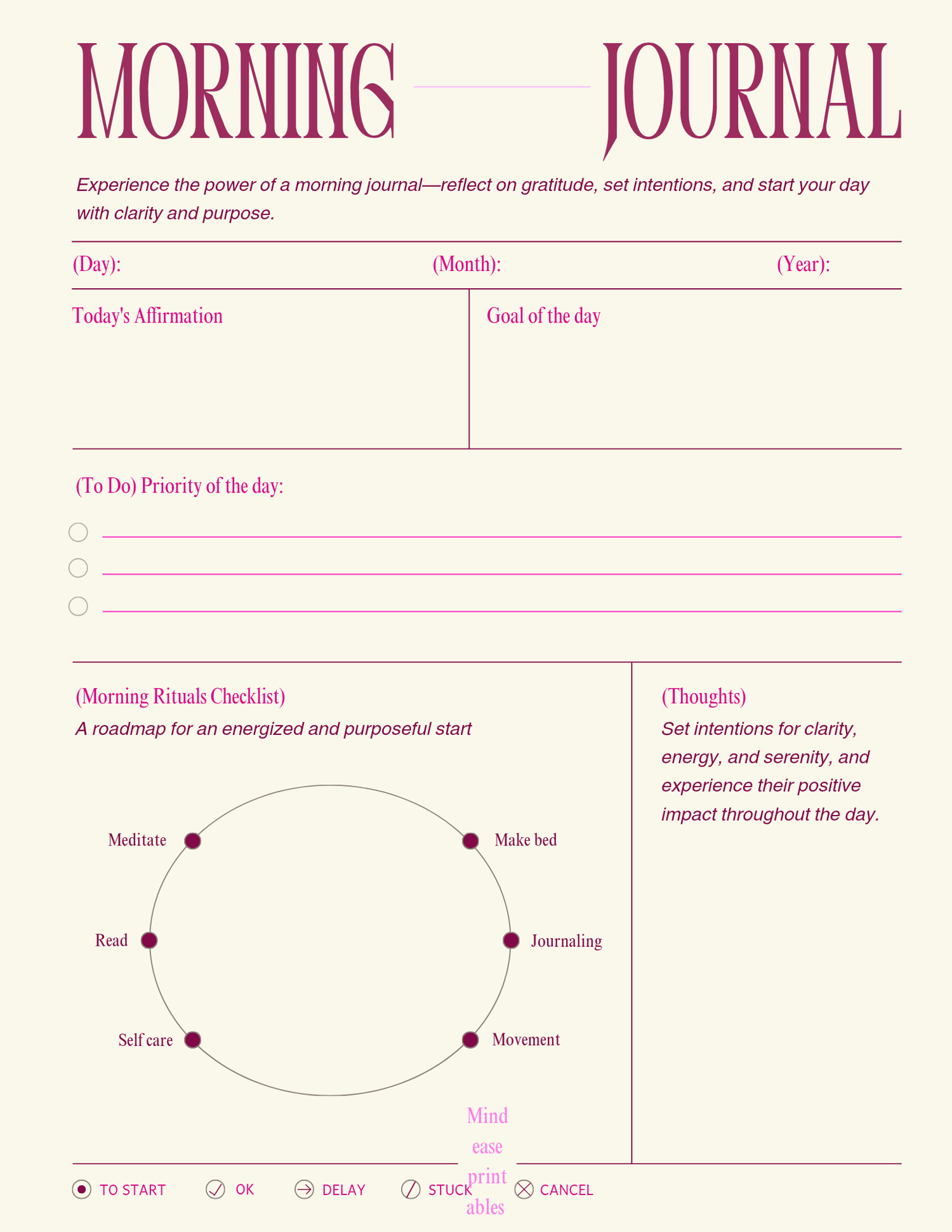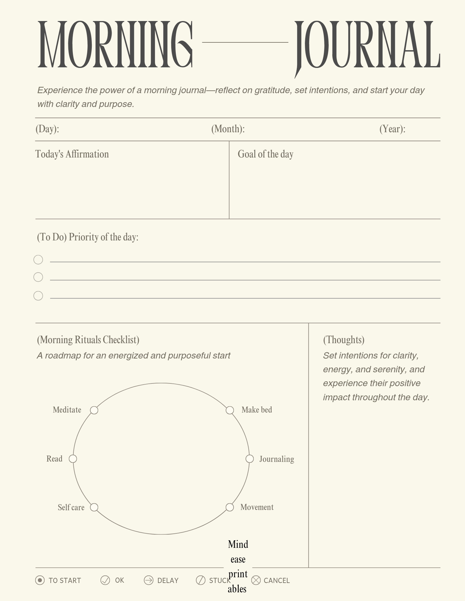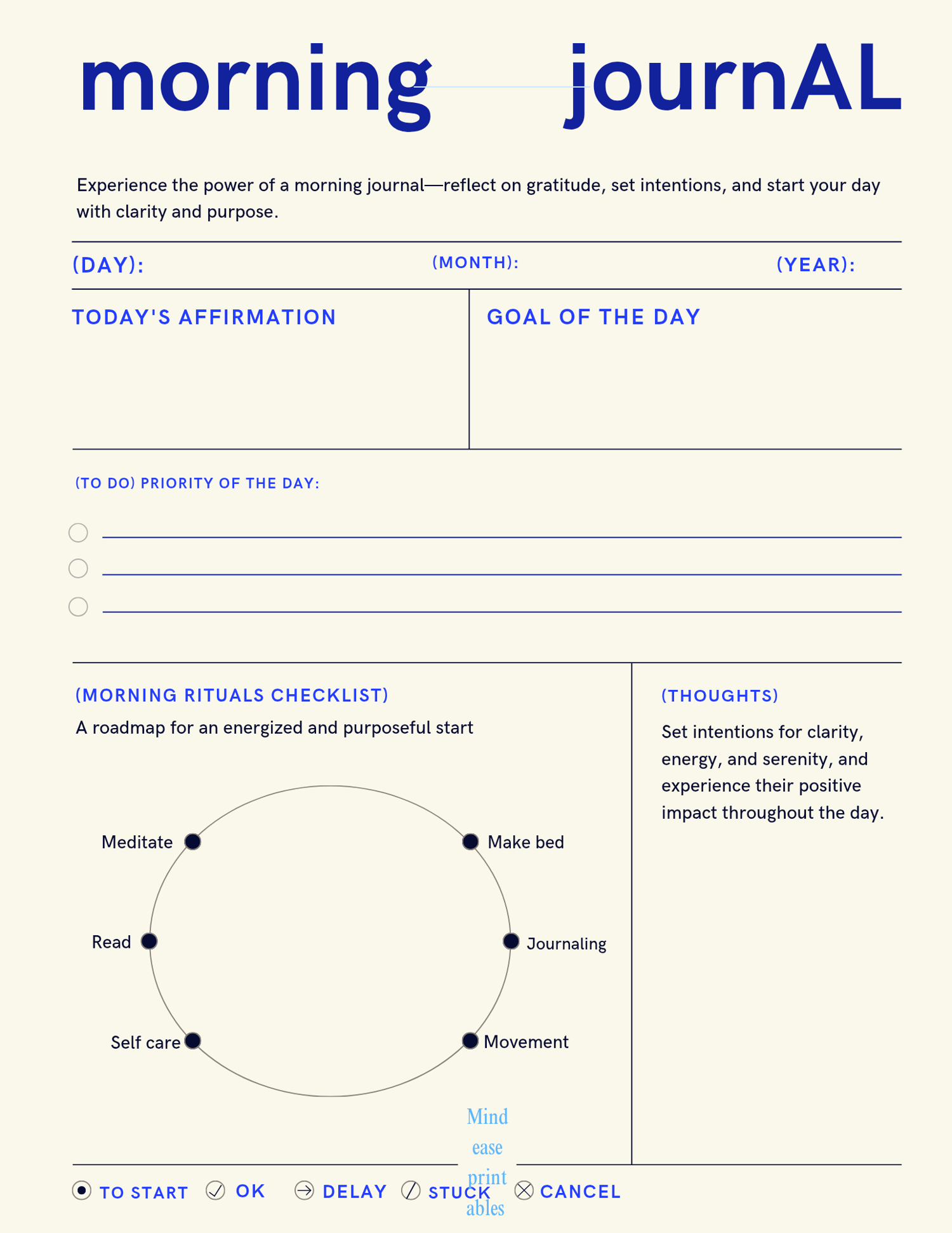 Begin each day with purpose and focus. The Morning Journal is designed to help you cultivate a clear mindset, align your goals, and set meaningful intentions for the day ahead. Through structured prompts and reflection, you’ll develop greater self-awareness, enhance productivity, and foster a positive outlook.