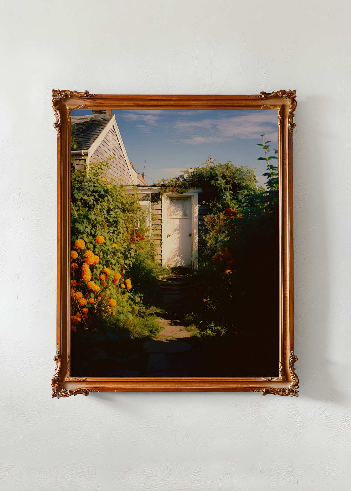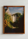 Garden Path to Summer— Tucked behind a curtain of blooming dahlias and vine-covered siding, this sunlit path leads to a weathered white door, like an invitation into a coastal daydream. The cottage glows in the golden light, wrapped in a riot of green and orange that hums with bees and quiet joy. It’s the kind of place where iced tea tastes sweeter, secrets feel safe, and summer lingers just a little longer. This print is pure backyard magic—intimate, wild, and full of gentle wonder.