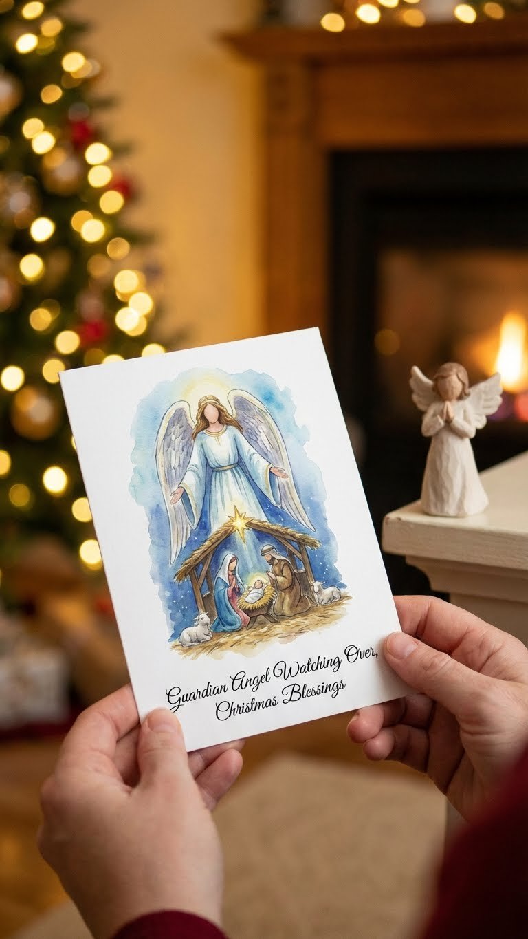 This peaceful Christmas card features a gentle guardian angel watching over the holy Nativity scene, symbolizing divine protection, heavenly care, and God’s loving presence. Bathed in warm golden light, the angel brings a message of peace, faith, and comfort. This sacred artwork beautifully expresses blessings, hope, and spiritual reassurance during the holy Christmas season.