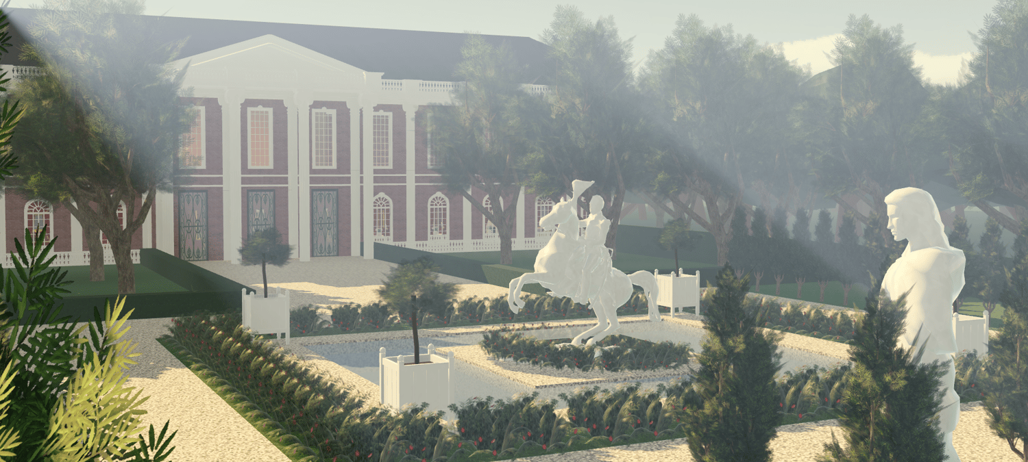 W&E Manufacturing's Colonial Manor is a grand country estate with intricate colonial and gilded age design and landscaping. It has everything you need: an outdoor area for garden parties, many rooms for different events, including sitting rooms, a dining room, a grand ballroom, and a cozy tea room.