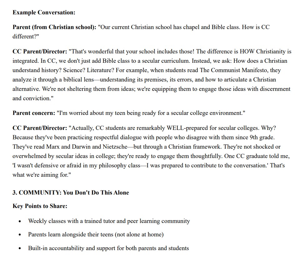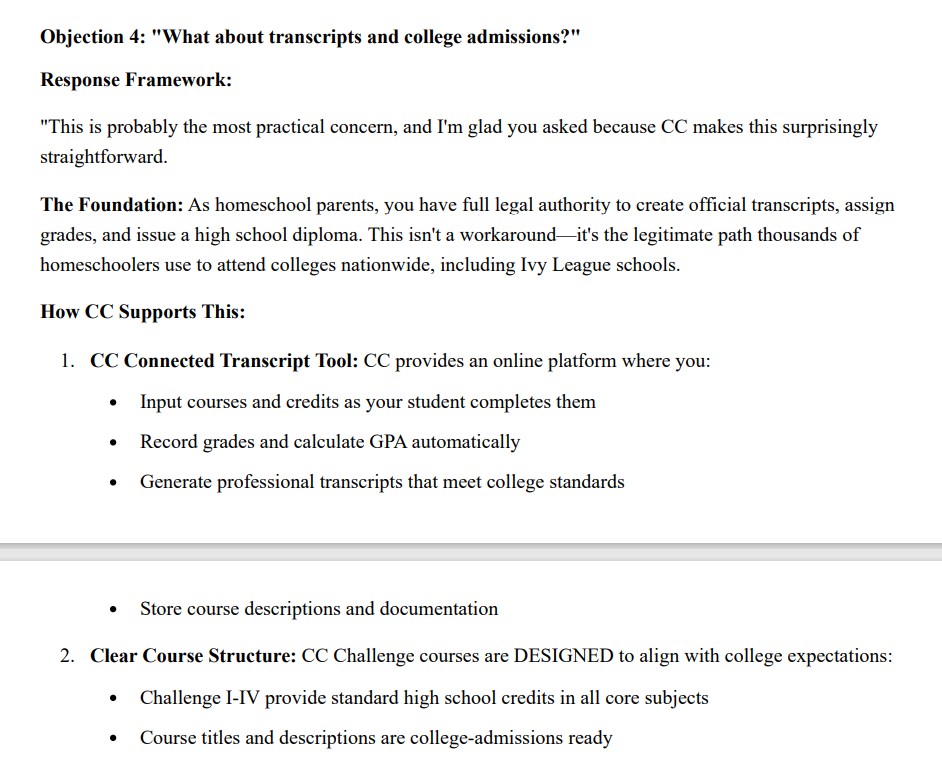 This Conversation Guide is the complete playbook for hosting a successful Classical Conversations "Classical Education Through High School" recruitment event and converting interested families into enrolled students. It provides word-for-word example dialogues addressing every major objection you'll encounter—from public school parents worried about socialization to independent homeschoolers resistant to community structure to Christian school families questioning the value of classical education. You'll know exactly what to say when parents push back on transcripts, express doubt about their teaching ability, or worry about college admissions. The guide walks you through the entire conversation flow from opening ice breaker to closing next steps, ensuring you confidently communicate CC's Classical, Christian, Community model.