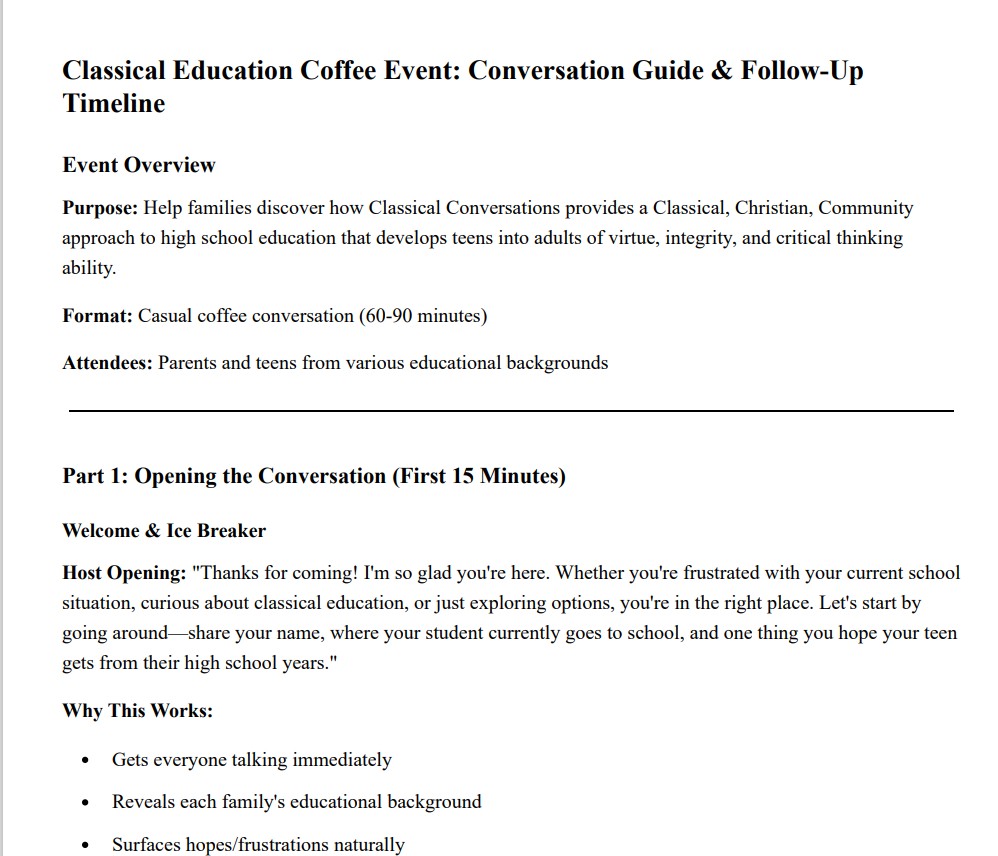 You're holding more than a conversation guide—you're holding a roadmap for transforming families. Every parent who walks into your coffee event carries hope mixed with frustration, wondering if there's something better for their teenager than an educational system that produces stressed, shallow, and directionless young people. You have an answer—Classical Conversations offers a path to raise teenagers who think deeply, speak articulately, and live with conviction through rigorous academics, Christian truth, and community support—but most parents have never heard of it and don't know where to start. This guide equips you with strategy, real dialogue examples, and a follow-up plan to have those sacred conversations with confidence, clarity, and grace.