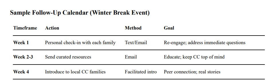 Beyond the initial event, this guide provides a strategic follow-up timeline with specific actions, sample messages, and calendar planning for both winter and spring semester recruitment cycles. You'll know when to text, what resources to send, how to introduce families to your local community, and when to gracefully step back from families who aren't a good fit. Whether you're a CC Director looking to grow your community or a passionate CC parent wanting to help other families discover classical education, this guide eliminates guesswork and gives you a proven framework to turn curious coffee shop conversations into committed Classical Conversations families.