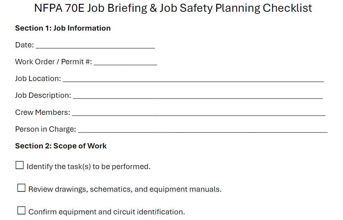 NFPA 70E Job Briefing Checksheet