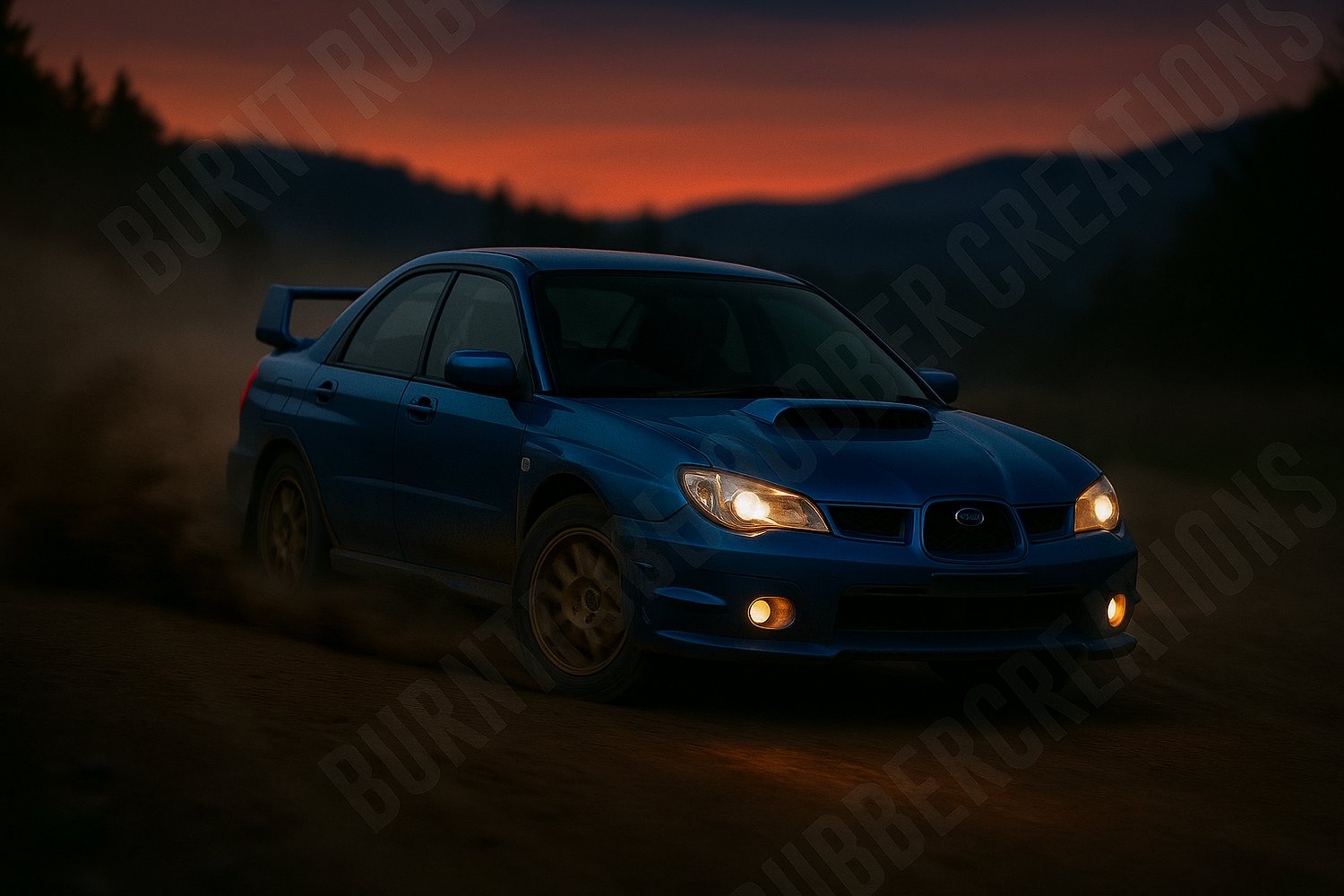 Experience the thrill of rally heritage with Dusk Drift, a cinematic capture of a Subaru Impreza WRX caught mid-drift on a twilight dirt road. The soft glow of dusk contrasts the raw energy of the moment—dust kicks up, tires claw at the earth, and the iconic silhouette of the WRX cuts through the fading light. Perfect for fans of JDM culture, rally racing, and high-adrenaline art. Add this electrifying piece to your collection and feel the rush every time you look at it