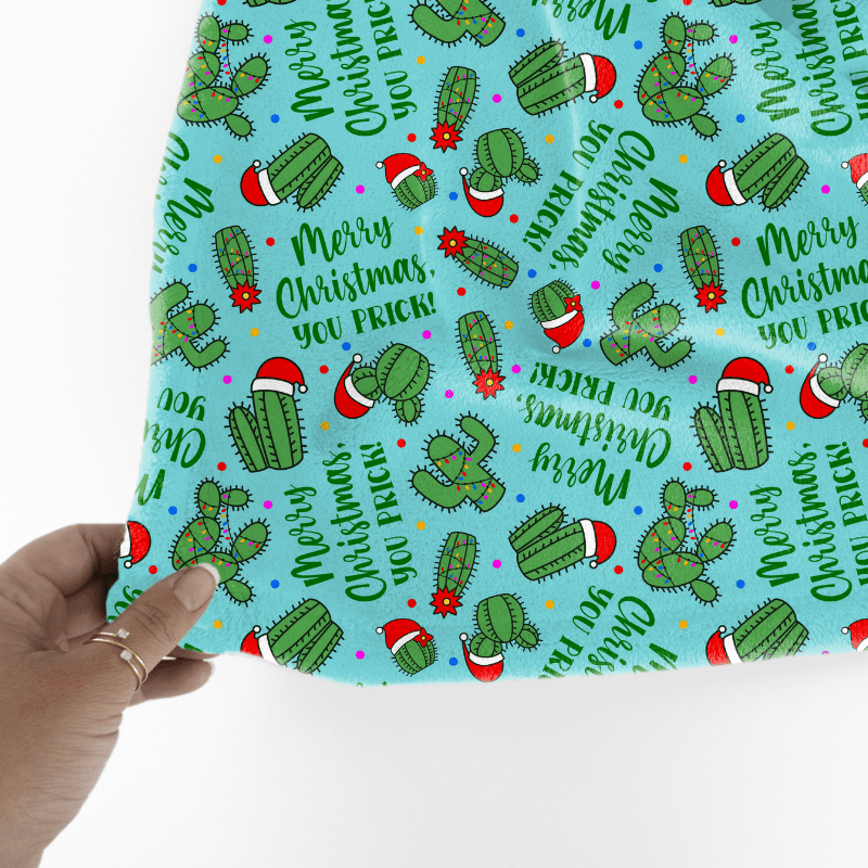 A sarcastic and sweary Christmas message! Don't be a prick, it's Christmas! Holiday cacti with Santa hats on blue.