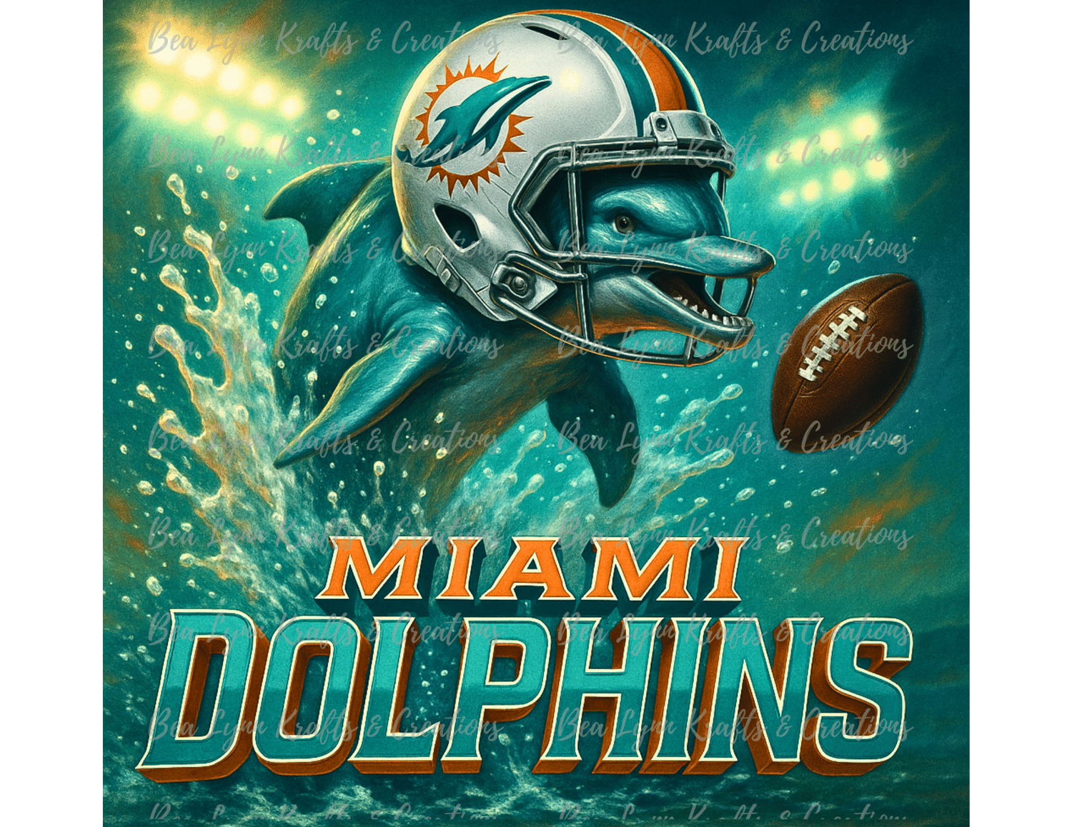 The bold MIAMI DOLPHINS lettering at the bottom is styled in the team’s signature teal and orange colors with a metallic, dimensional finish. Delivered as a high-resolution transparent PNG, this design is perfect for crafters, sports fans, boutique shop owners, and sublimation artists who want premium, high-impact Dolphins artwork for physical products.