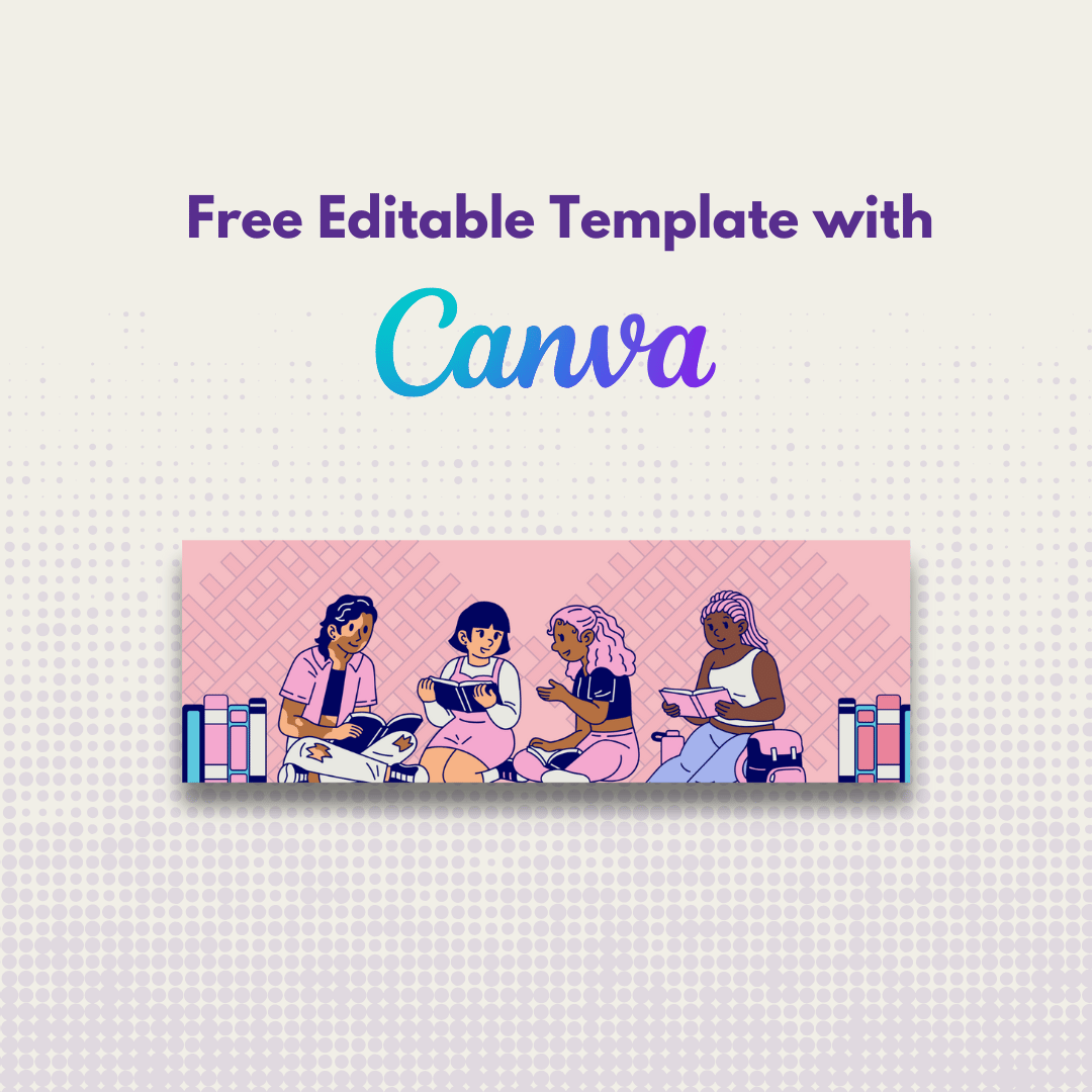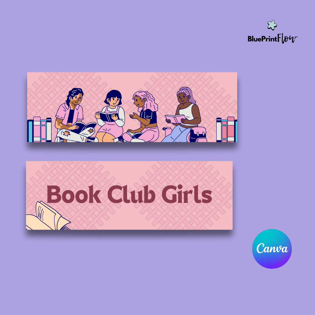 The first design highlights the bold "Book Club Girls" text over a soft pink and purple patterned background, while the second features a group of diverse friends enjoying books together, celebrating the joy of reading and connection. Perfect for booklovers, these templates are fully editable and customizable on Canva, making them ideal for promoting events or personal use.
