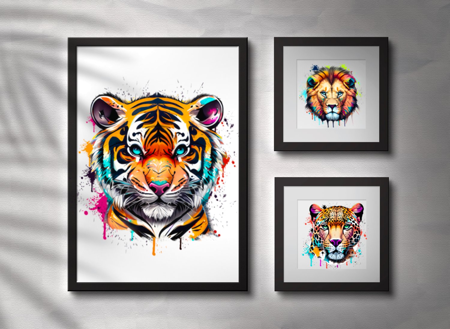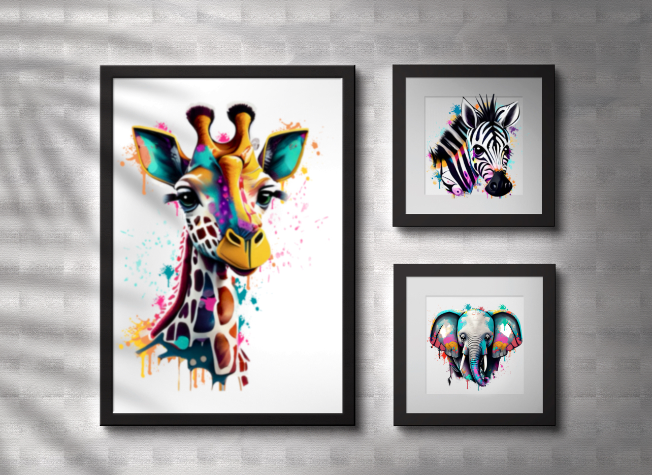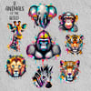 Animals of the wild graffiti art. Elephant, chimpanzee, tiger, lion, leopard, zebra, giraffe, gorilla