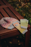 The hat is accompanied by End of Summer Mitts with the same motif. If you add both in the cart now, the mitts are 50% off. The promo runs indefinitely. No code needed. Happy knitting!