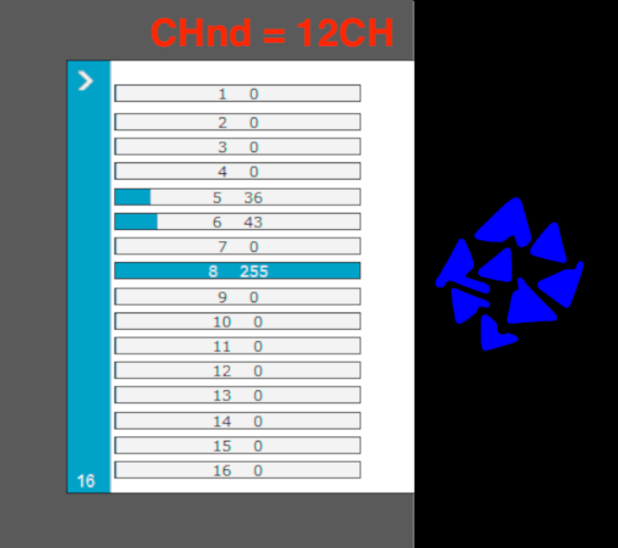 * En el modo de 12CH Verifique, con un Fixture de pruebas (click), que coincidan estos canales: 8 Dimmer, 5 en el valor 35 = Azul, 6 en el valor 43 = Gobo de la cuarta foto.