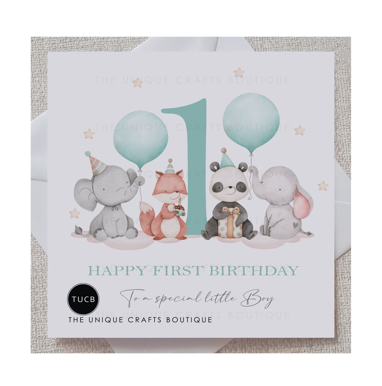 This card is perfect for a sweet little Boys First Birthday, with a collection of cute watercolour animals sitting on a cloud delicately holding balloons and wearing party hats.