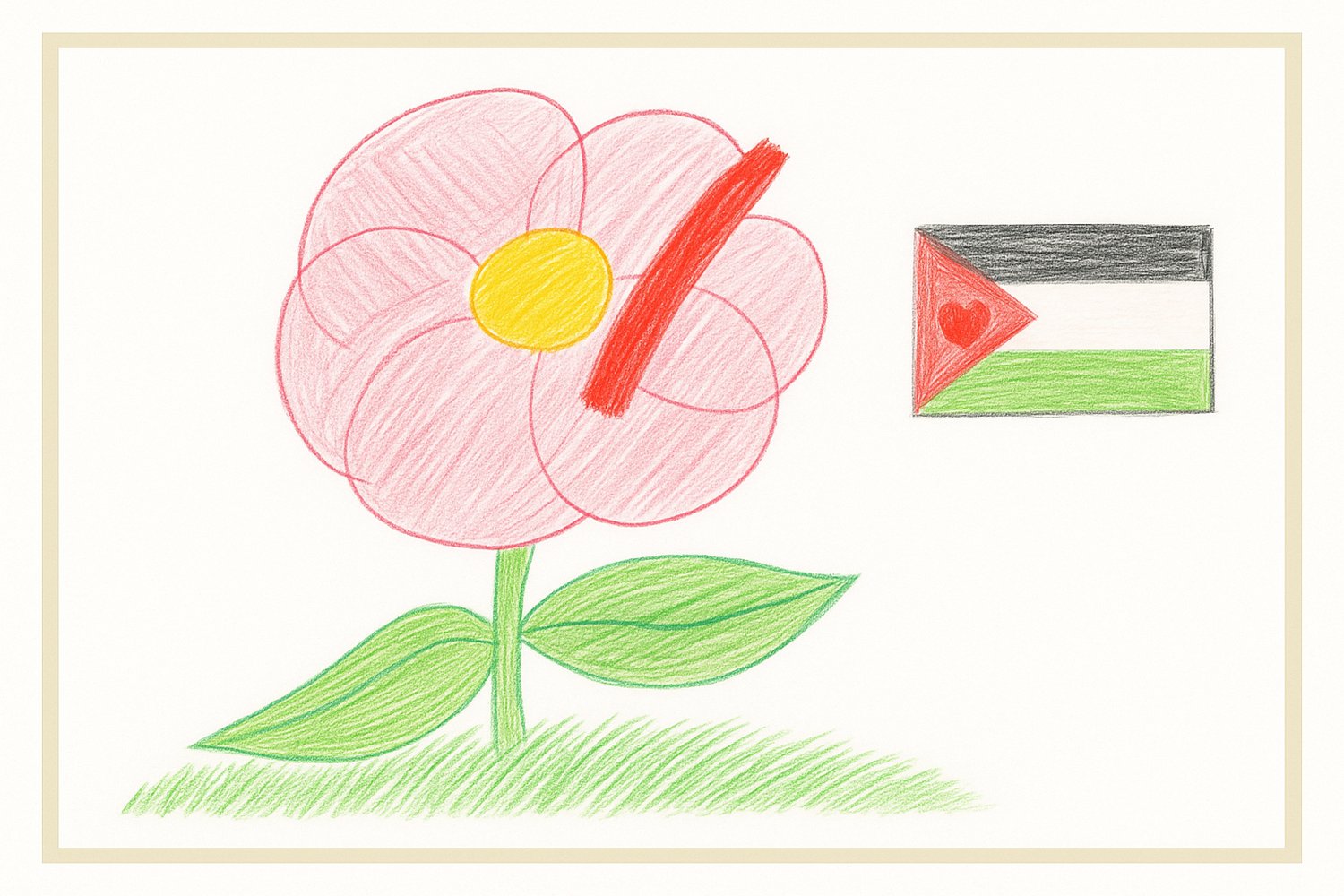 This artwork was created by Kinda, a 5-year-old girl from Gaza, who expressed her love for Palestine through a flower and her flag.