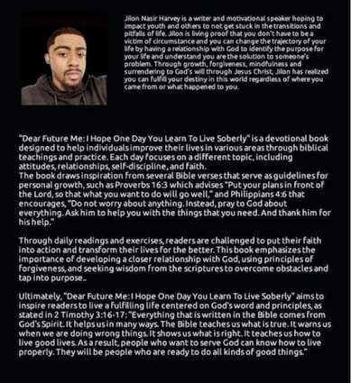Ultimately, "Dear Future Me: I Hope One Day You Learn To Live Soberly" aims to inspire readers to live a fulfilling life centered on God's word and principles, as stated in 2 Timothy 3:16-17: "Everything that is written in the Bible comes from God's Spirit. It helps us in many ways. The Bible teaches us what is true. It warns us when we are doing wrong things. It shows us what is right. It teaches us how to live good lives. As a result, people who want to serve God can know how to live properly. They will be people who are ready to do all kinds of good things.”