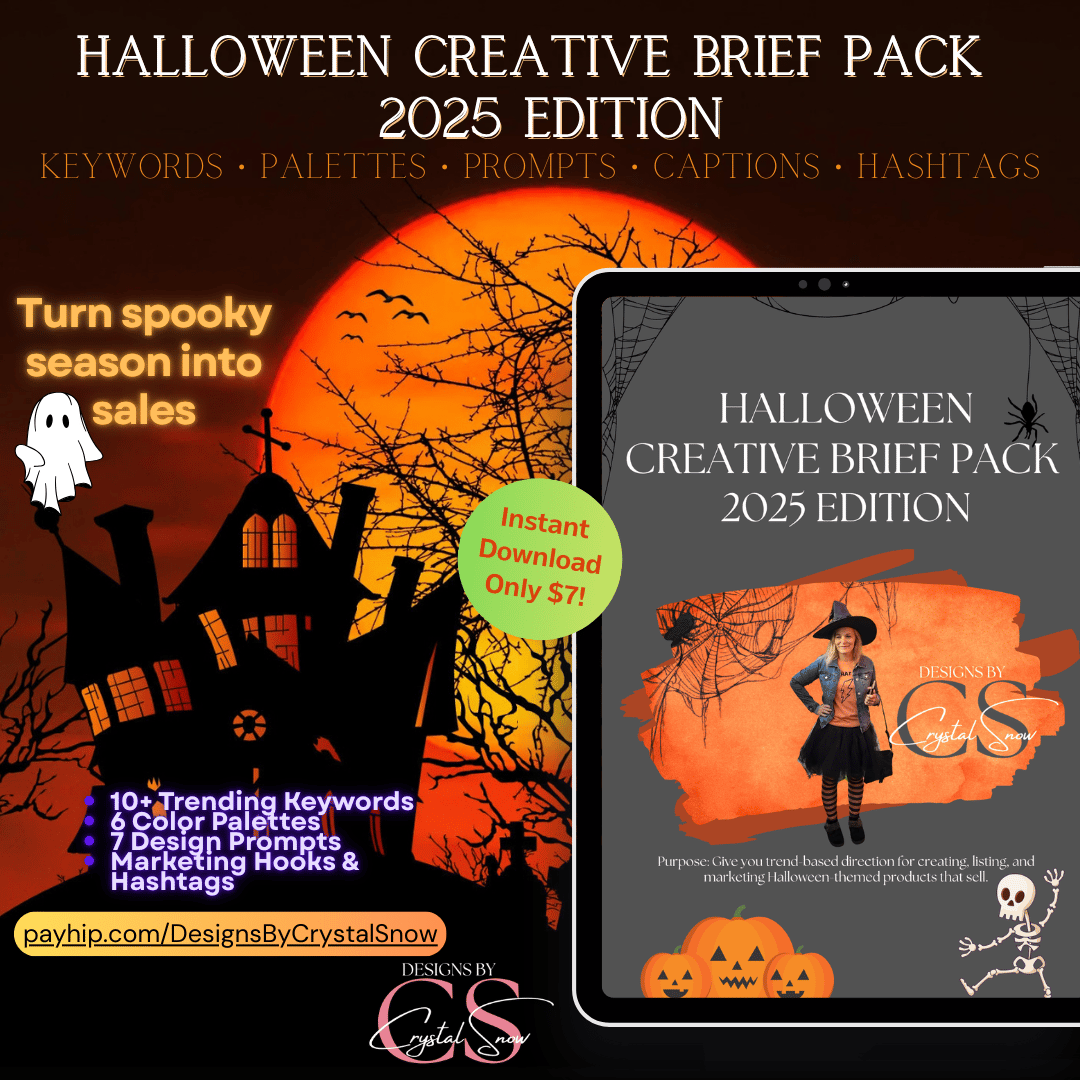 Struggling with what to design for Halloween this year? 👻 This Creative Brief Pack gives you everything you need — keywords, color palettes, design prompts, and marketing hooks — to create and sell products that actually trend.