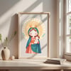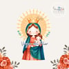 1x Ilustración principal de la Virgen del Pilar: Una imagen completa de la Virgen María sobre la columna, con el Niño Jesús, en un estilo dulce y moderno. Ideal para invitaciones, estampitas, posters, recuerdos y más.