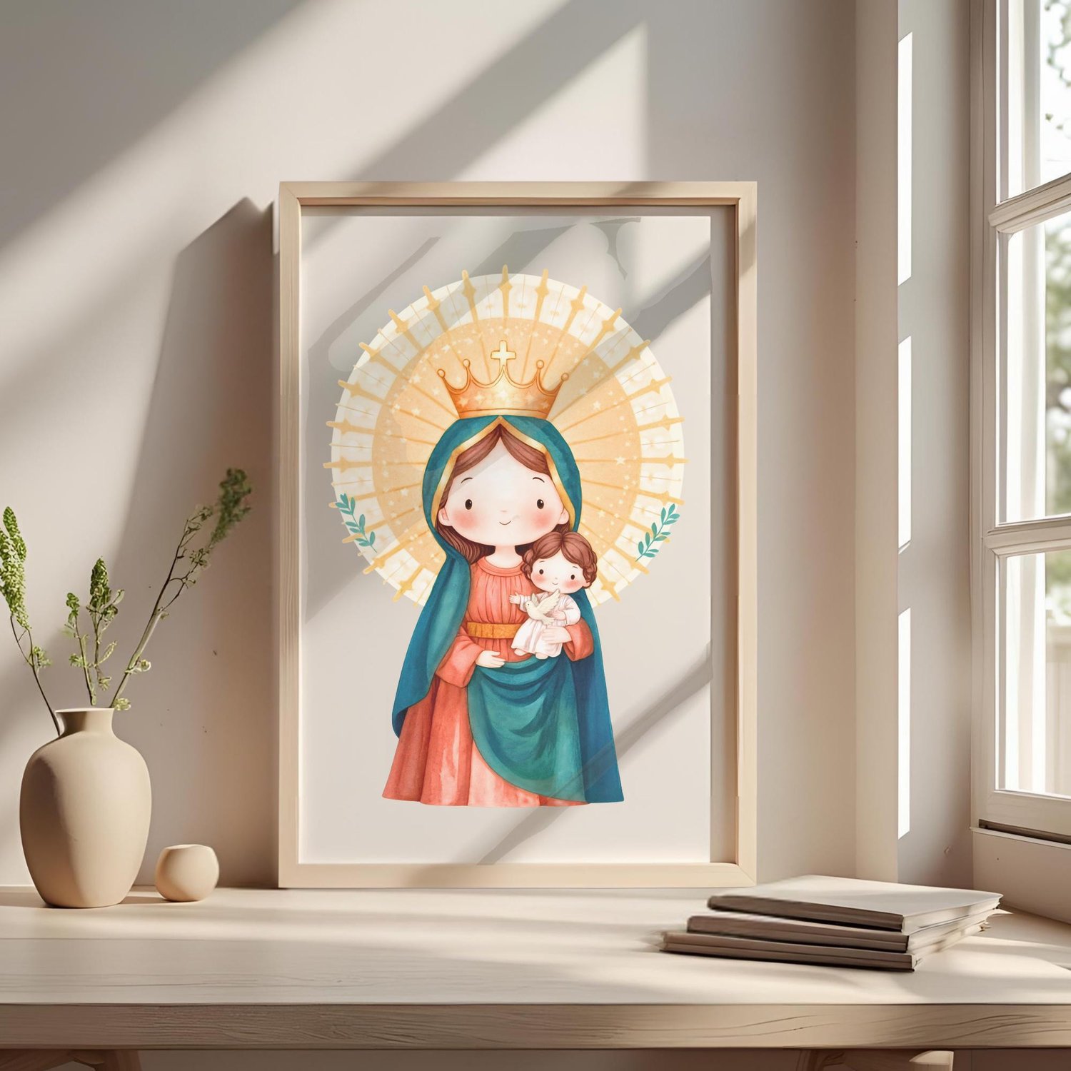 Celebra tu fe con esta hermosa ilustración digital en acuarela de la Virgen del Pilar de Zaragoza, la muy querida Patrona de España y de la Hispanidad. Este set de descarga instantánea es perfecto para una variedad de proyectos creativos y devocionales, honrando la tradición y la profunda devoción a la Virgen María bajo esta advocación.