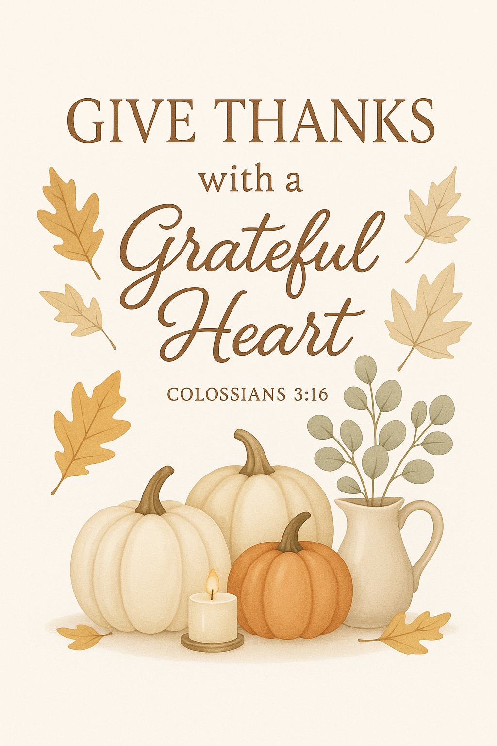 Celebrate the season with warmth and worship through this Autumn Harvest Scripture Poster, featuring pumpkins, fall leaves, a glowing candle, and a ceramic pitcher with foliage. Paired with Colossians 3:16, this printable offers spiritual beauty and cozy charm — perfect for Thanksgiving décor, devotional kits, or ministry gifts.