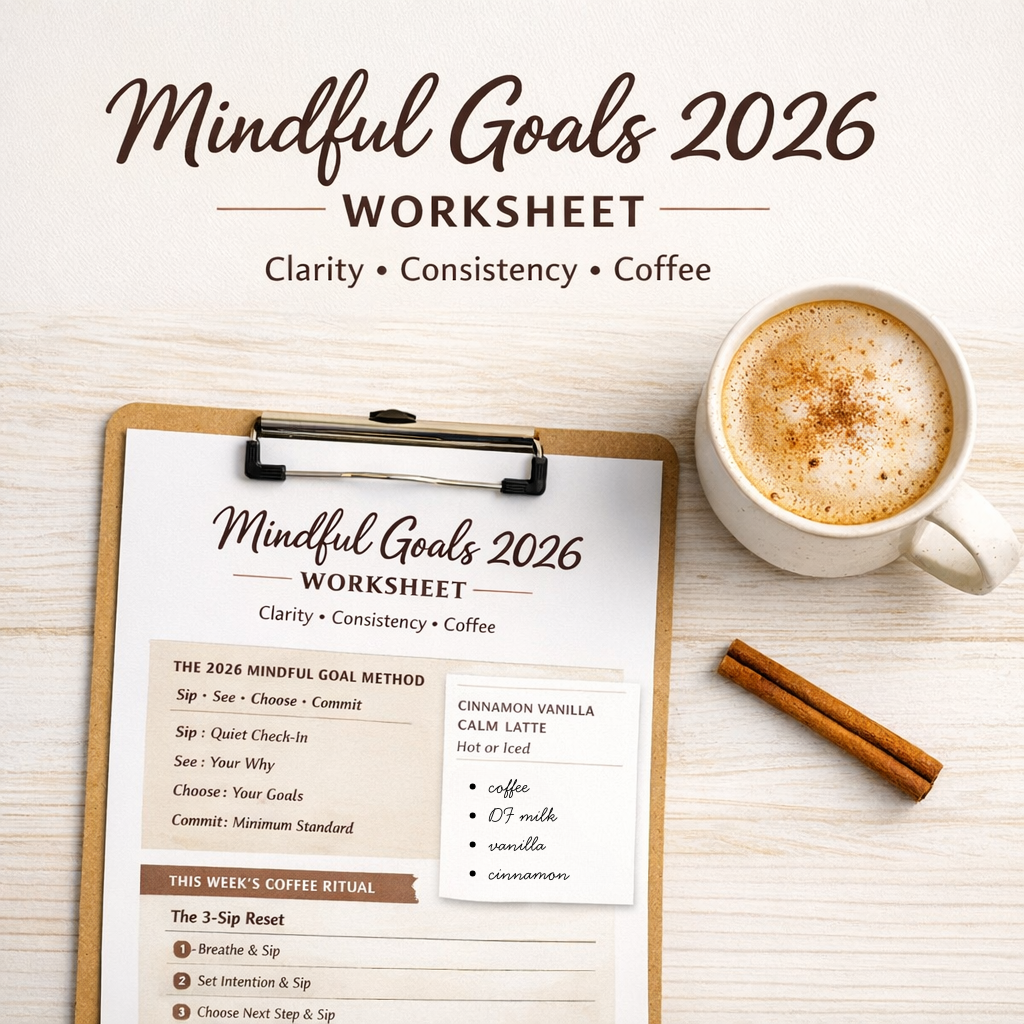 Set goals that feel grounded, realistic, and aligned with your life—not pressure and perfection. This 1-page worksheet walks you through a simple mindful goal-setting process, plus a weekly check-in to help you stay consistent. Includes a cozy coffee ritual and a Cinnamon Vanilla “Calm” Latte recipe to make your reset feel like a moment, not a chore.