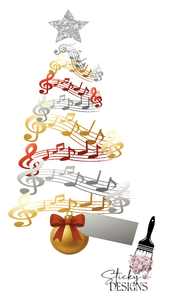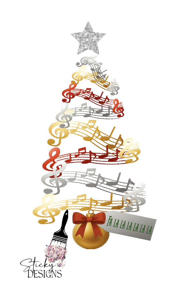 2 Christmas musical notes inspired trees one with a tag for your personalisation and one with a tag with the saying FA LA LA LA LA LA! designs all free size, lots of options from UVDTF, DTF acrylic, cushions or maybe cards