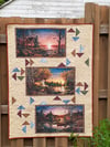 You can use a ⅔ yd panel with three equal size pictures, or a larger scale print. Make Flying Geese and scatter them around the “pictures”, having them fly this way and that. The cover quilt has 32 Flying Geese, but you can make more, or less. Make them all out of the same fabric or make them with three, four, five or however many fabrics you’d like to use. I use Deb Tucker's Studio 180 Design® Wing Clipper to make the Flying Geese, but the no-waste method is included in the instructions.