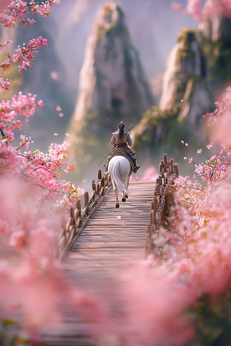 Step into a serene yet heroic scene with a hyper-detailed ancient Chinese warrior riding a horse across a wooden bridge between towering mountains. Bathed in soft, backlit warm light and surrounded by a vibrant flower field, every detail—from the warrior’s armor to the miniature-scale textures—creates a cinematic, peaceful atmosphere. Perfect for creators seeking visually stunning, professional-quality imagery that blends dynamic action with tranquil natural beauty.