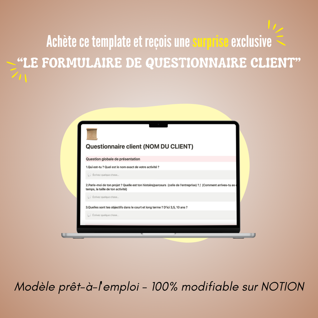- Un formulaire de questions sur Notion, prêt à être partagé à vos clients pour recueillir toutes les informations clés dès le début de la mission.