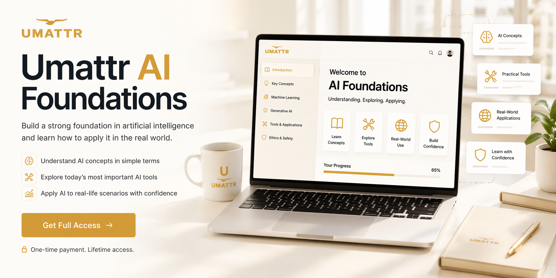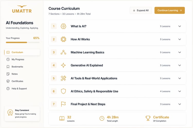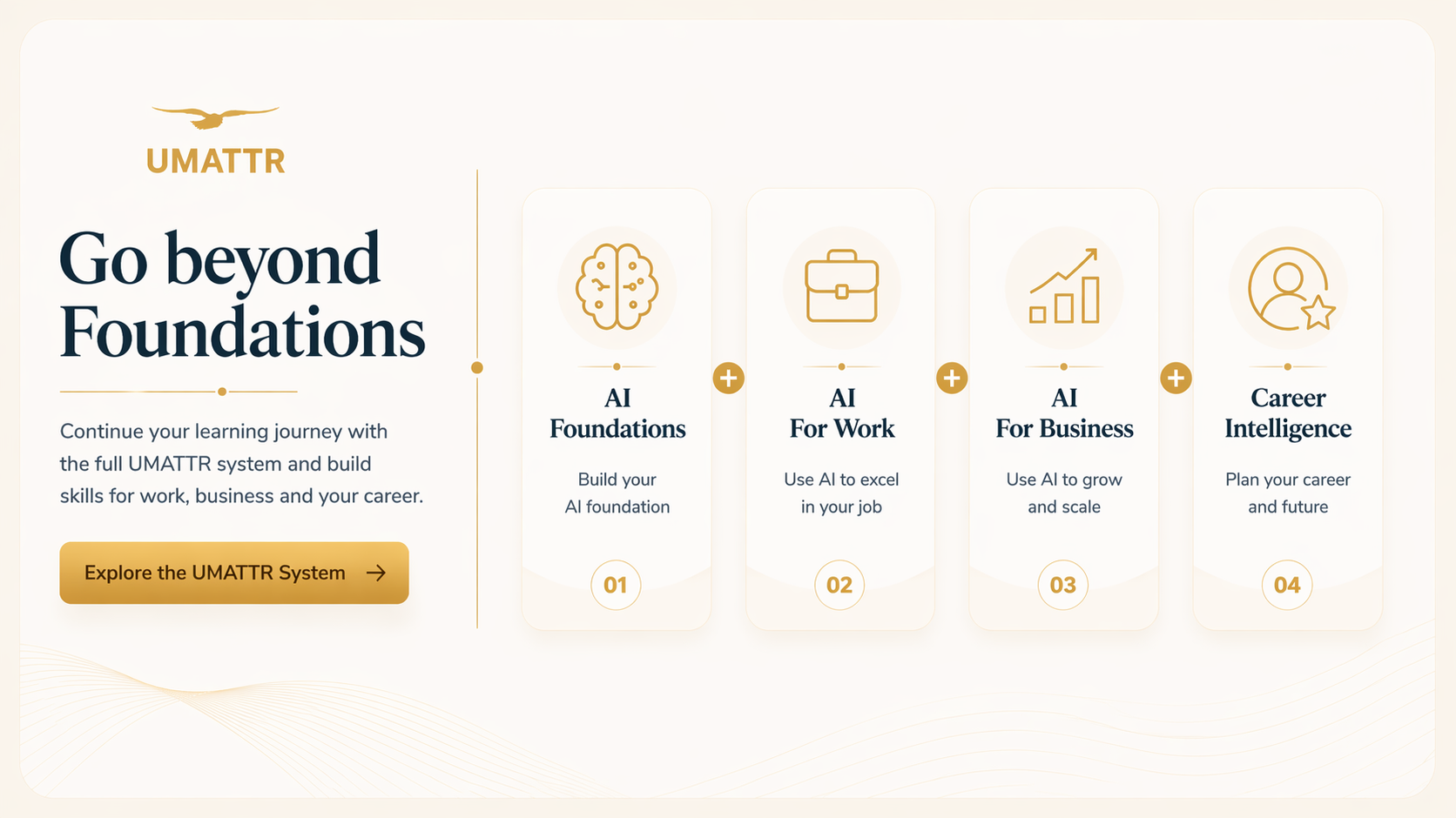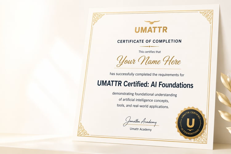 Complete the course and receive UMATTR Certified: AI Foundations, a professional certificate that reflects your understanding of core AI concepts, tools, and real-world applications. It is designed to give your learning a clear outcome and a credible finishing point.