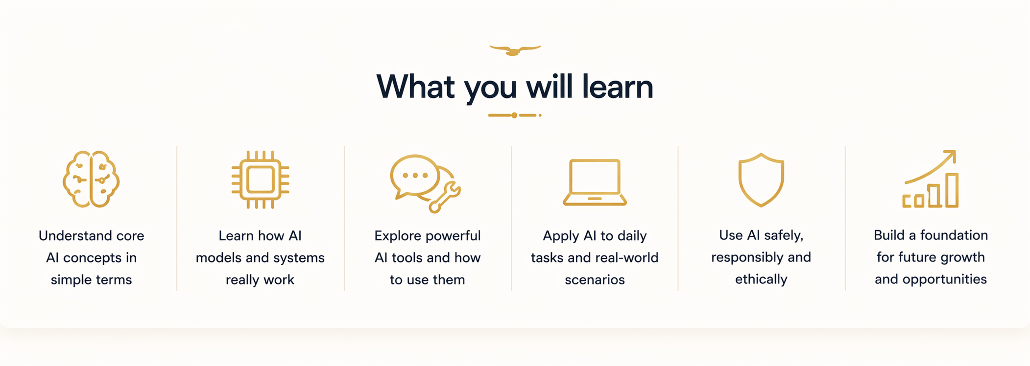 You will learn core AI concepts, how modern AI systems work, how to use important AI tools, how AI applies to real-world tasks, and how to use AI safely and responsibly.