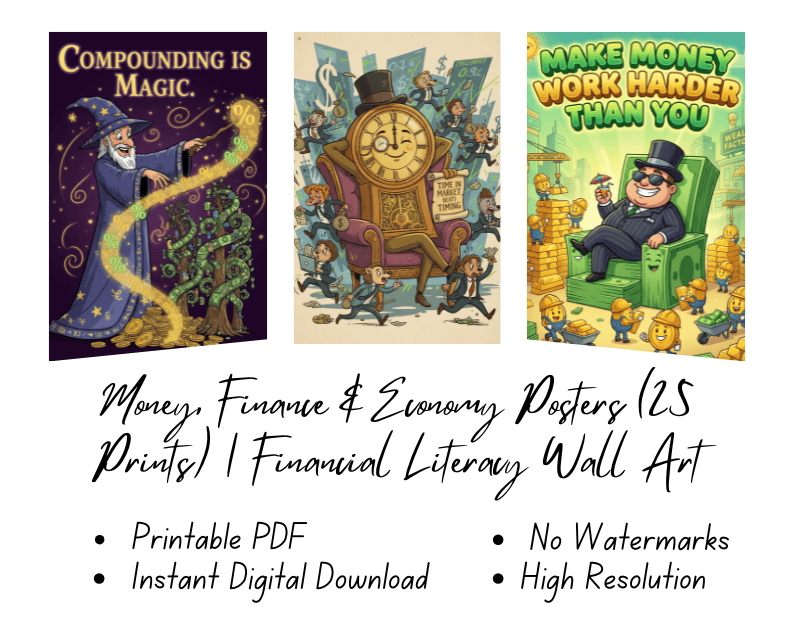 Upgrade your workspace with this powerful Money, Finance & Economy Posters Bundle (25 Prints) — a premium collection of financial literacy wall art designed to inspire smarter thinking, disciplined investing, and wealth-building habits every day.
