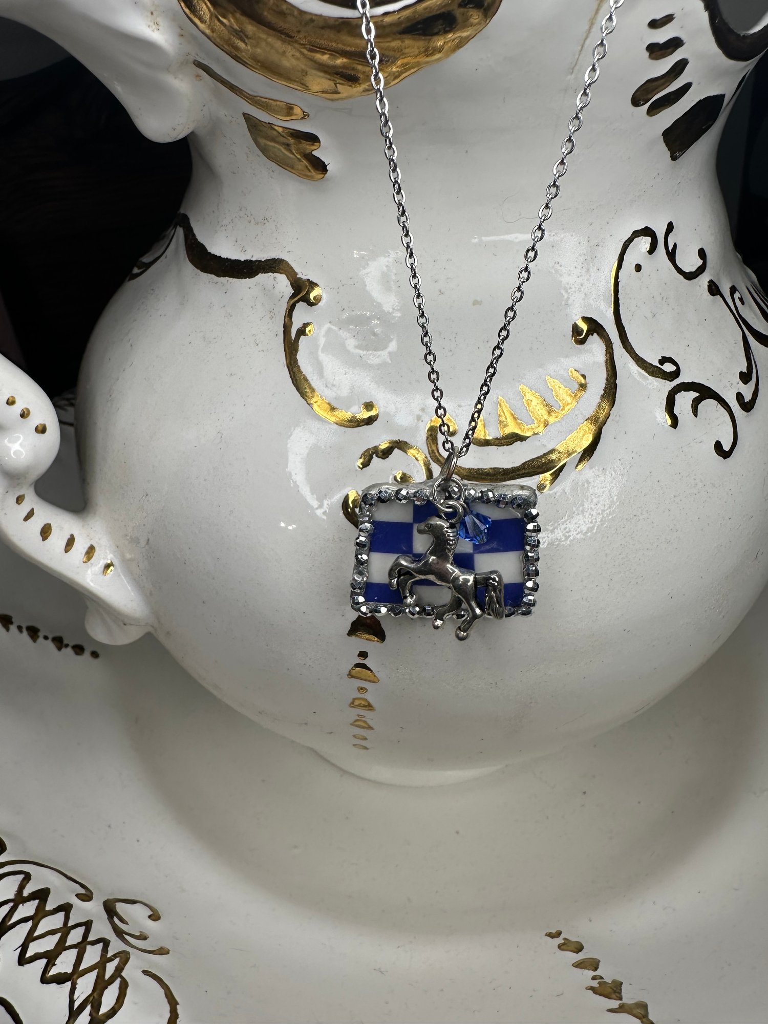 Add a touch of whimsical elegance to your style with this one-of-a-kind handmade necklace. The pendant features a bold blue-and-white checkered background framed with shimmering metallic beads, showcasing a silver prancing horse charm at the center. A faceted blue crystal adds just the right sparkle, making this piece both playful and sophisticated.