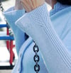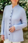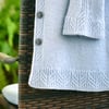 Pale Breeze cardigan is knit in stockinette, accented with a delicate twisted stitch cable through the collar, button band, cuff and hem. The sweater is worked in one piece, seamlessly from the top down using the contiguous sleeve construction.